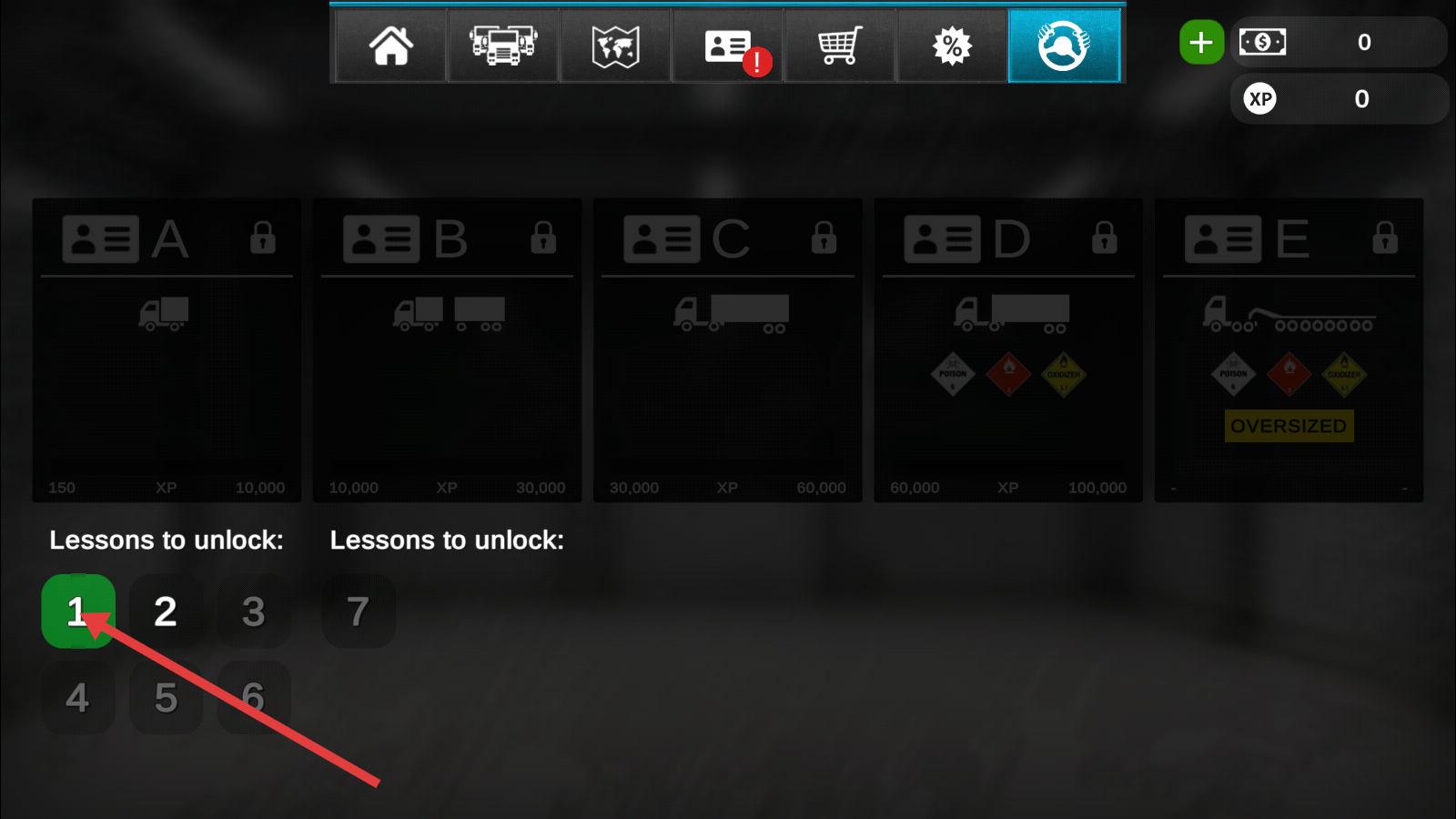 2、点击顶部【证件】图标,进入执照界面,选择解锁【课程1】,开启驾照获取流程,为驾驶卡车奠定资格基础。