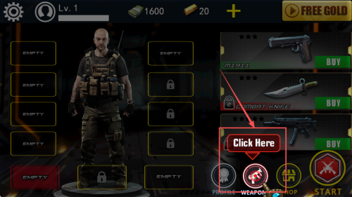 3、如何装备武器:购买武器后,点击“Click Here”按钮选择武器,然后点击“CONFIRM”按钮确认装备。