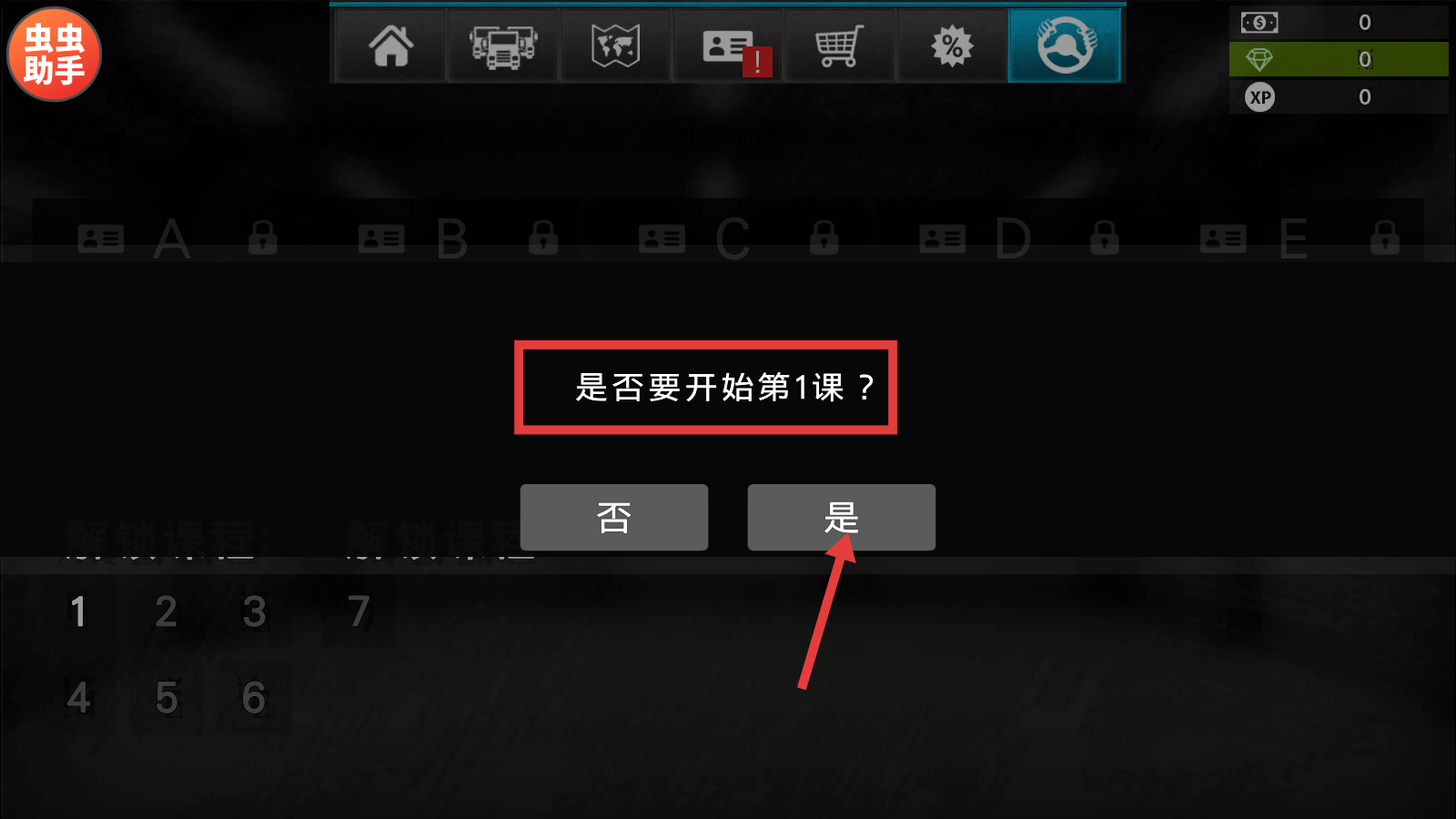 1、点击“是”,确认开启第1课,正式进入驾照学习流程,为获取驾驶资格迈出第一步。