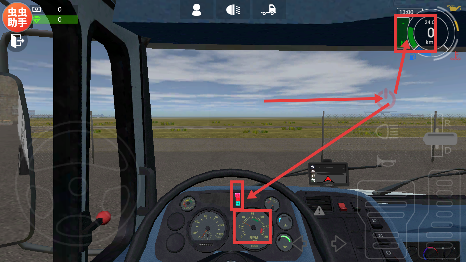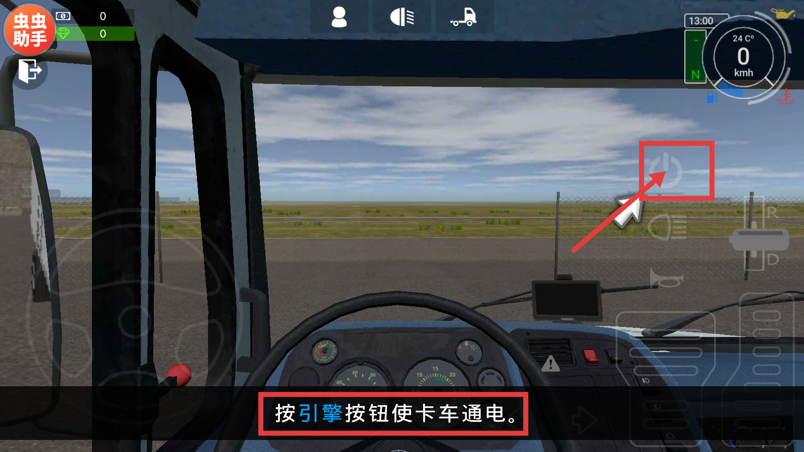 2、在驾驶界面点击引擎按钮,使卡车通电,激活车辆系统,为后续驾驶操作做好准备。
