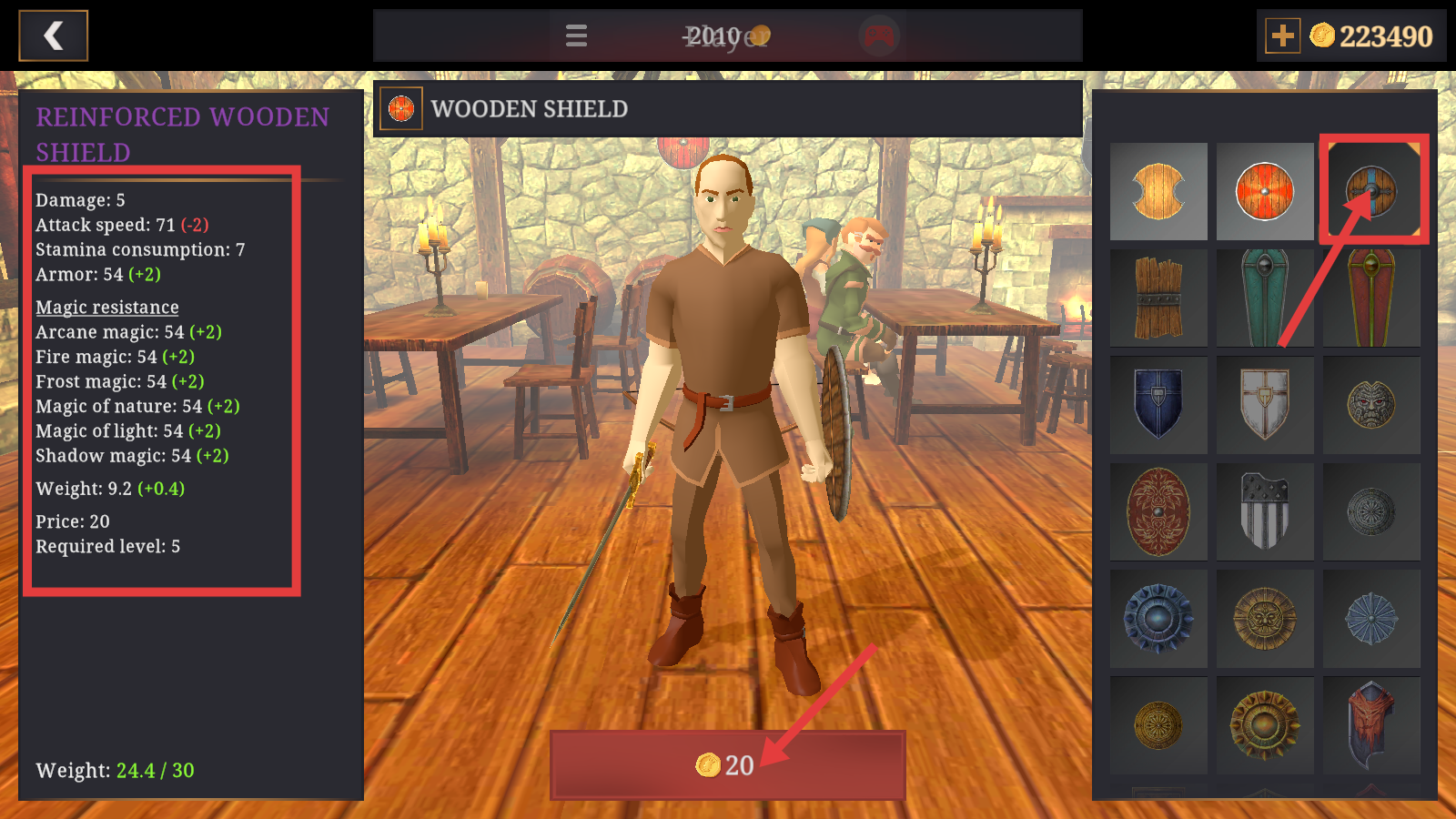 3、在装备界面,花费【20】金币可购买【REINFORCEDWOODENSHIELD】,其具备攻击、防御等多项属性加成,提升角色战力。