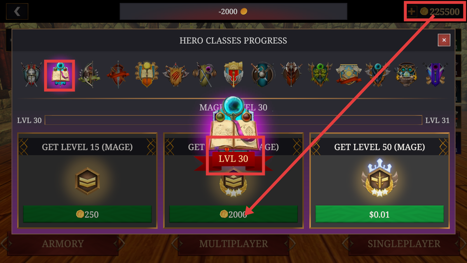 2、在【HEROCLASSESPROGRESS】界面,提升【MAGE】职业至【LVL30】,可领取【2000】金币奖励,积累金币助力角色发展。