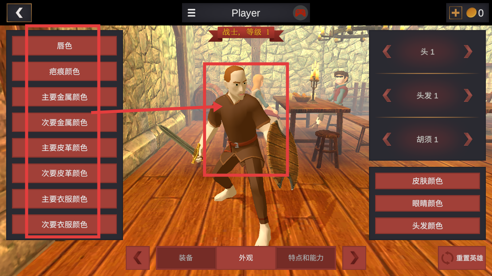 1、在外观界面,可自定义【唇色】【疤痕颜色】等多种外观属性,打造独特的【战士-等级1】角色,提升角色辨识度。