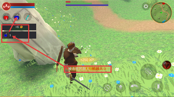 3、击败【机器人3】可获得【+250-XP】、金币及道具,积累资源助力角色升级与装备提升,强化战力。