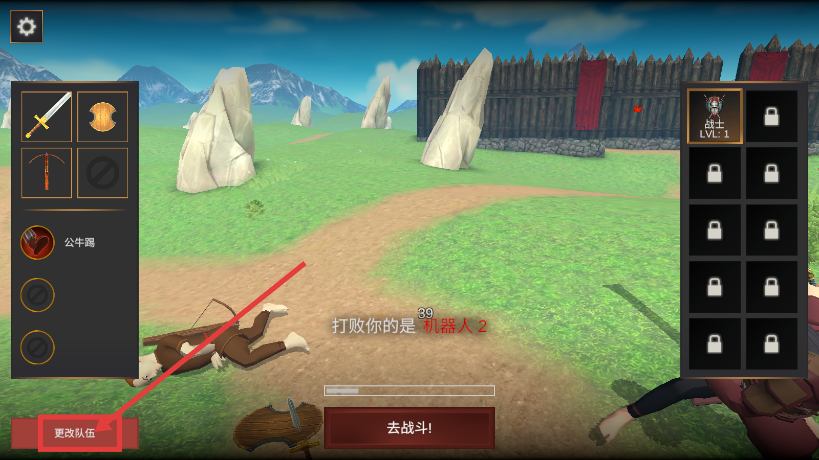 4、战斗前可点击【更改队伍】调整阵容,装备初始武器并利用【公牛踢】技能,点击【去战斗!】开启对局。