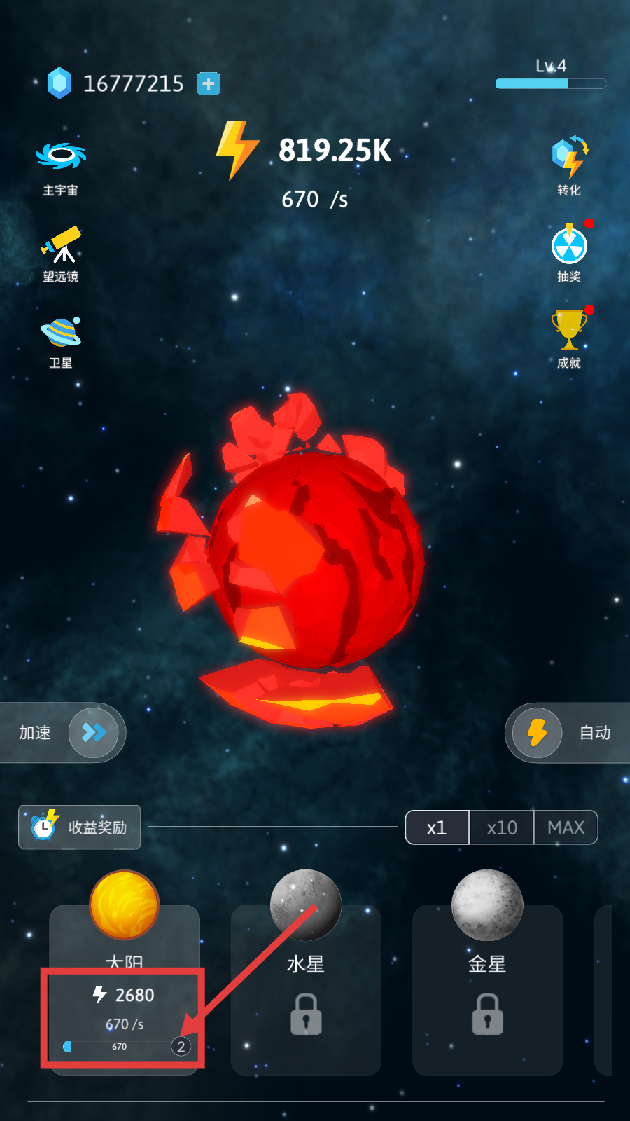 1、升级太阳至产能【2680-670/s】,提升资源获取效率,为解锁水星、金星等天体积累资源。