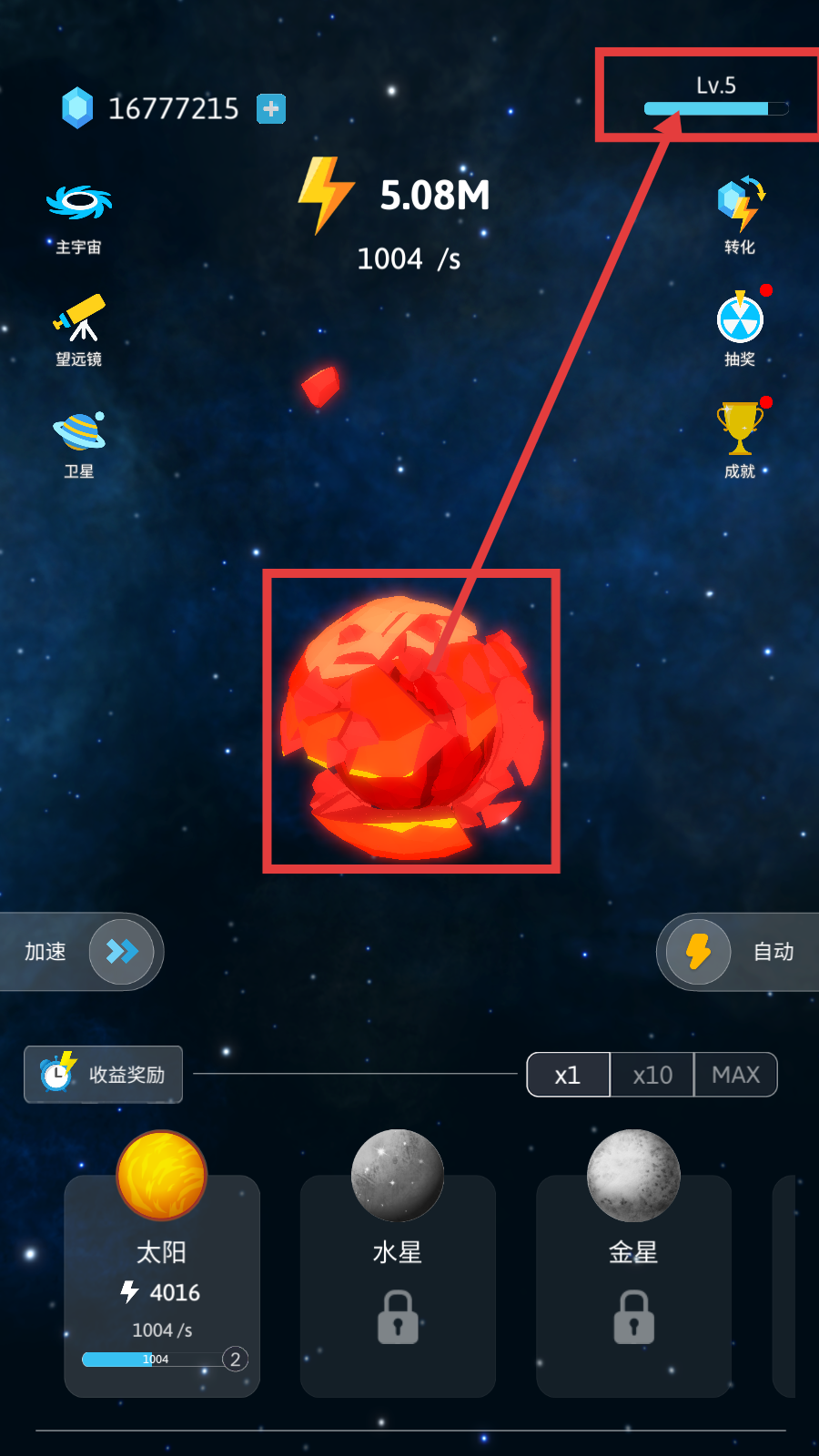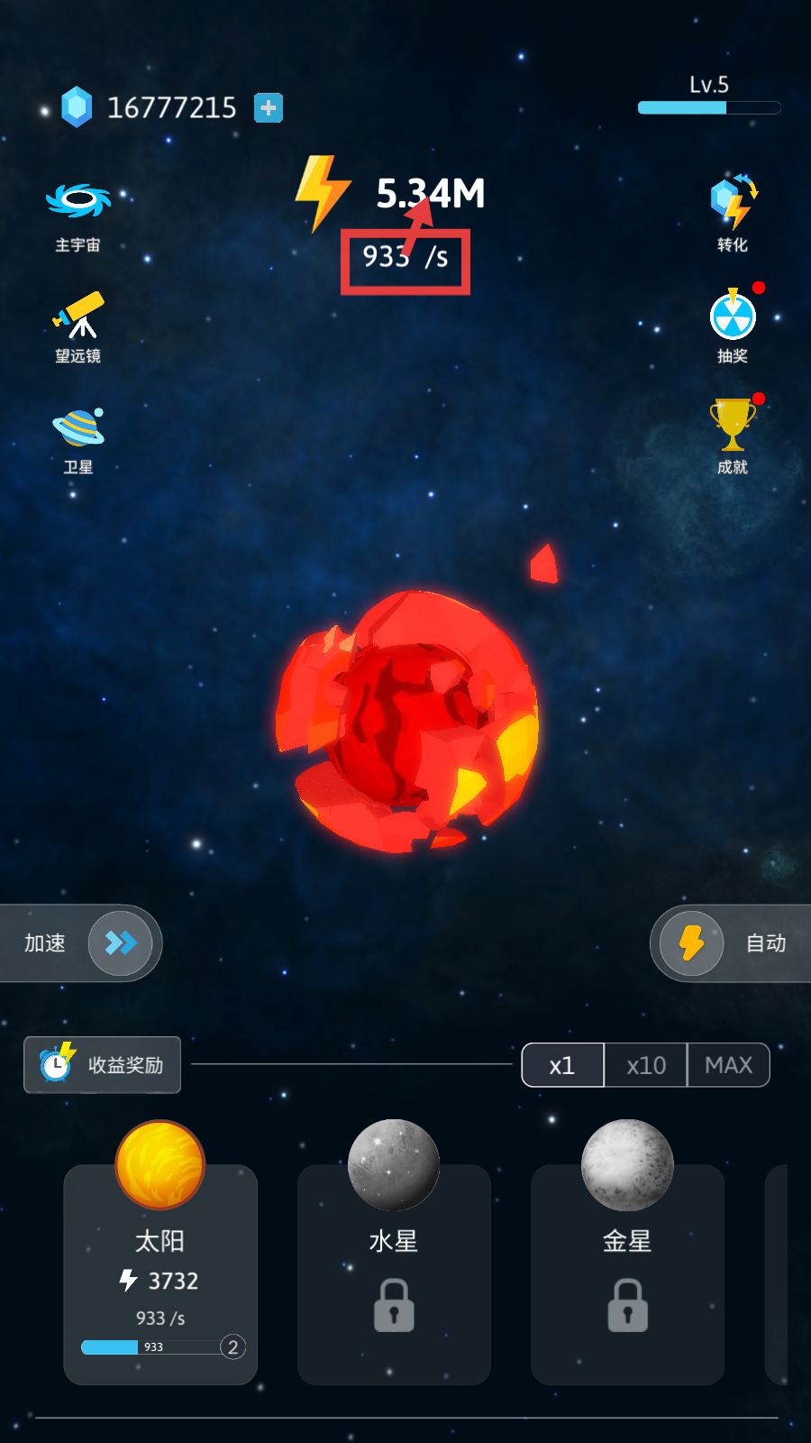 3、提升等级至【Lv.5】,太阳外观变化,产能达【1004/s】,高等级助力天体发展。