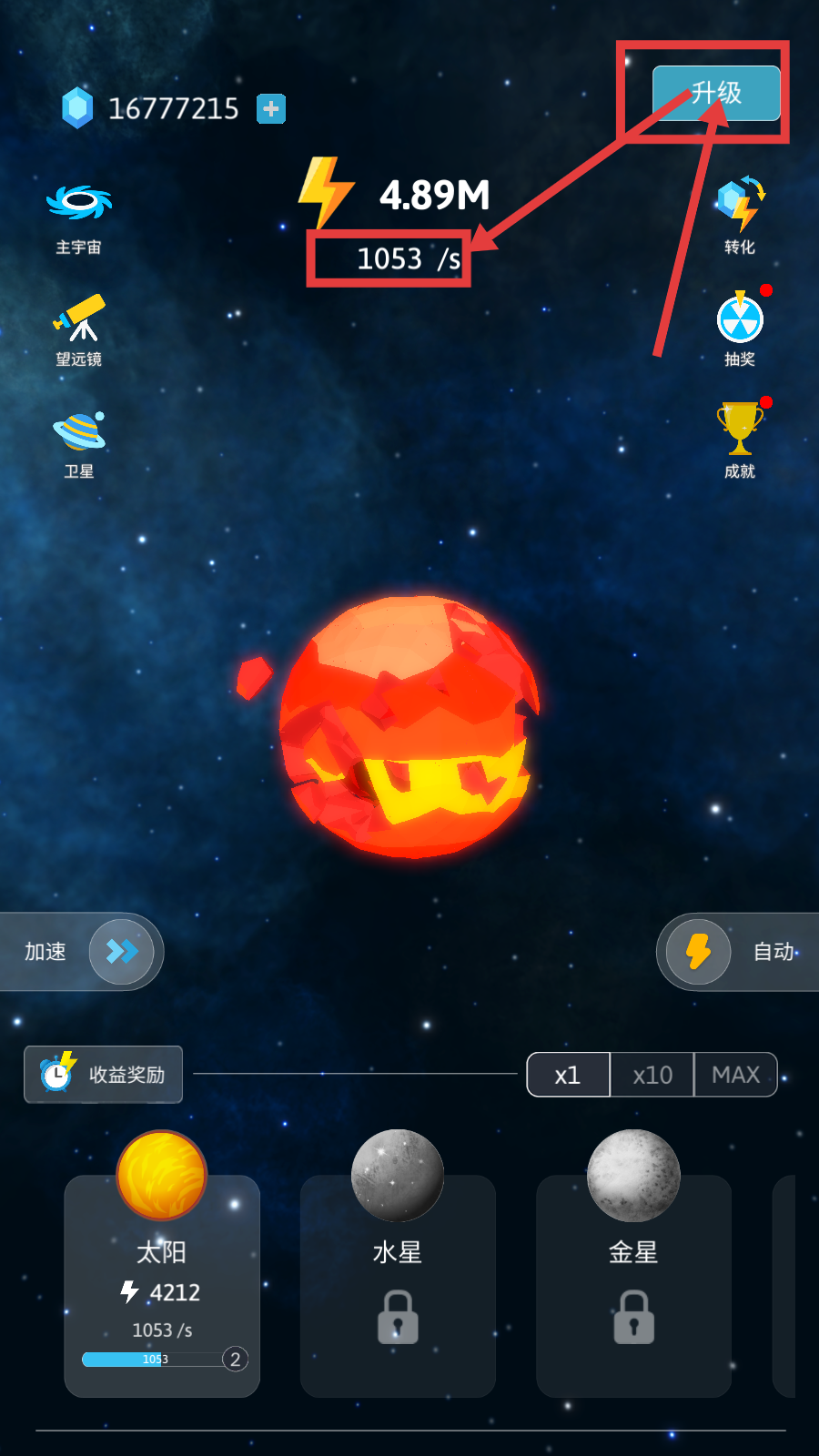 4、点击【升级】按钮,太阳产能提升至【1053/s】,持续升级增强资源产出能力。