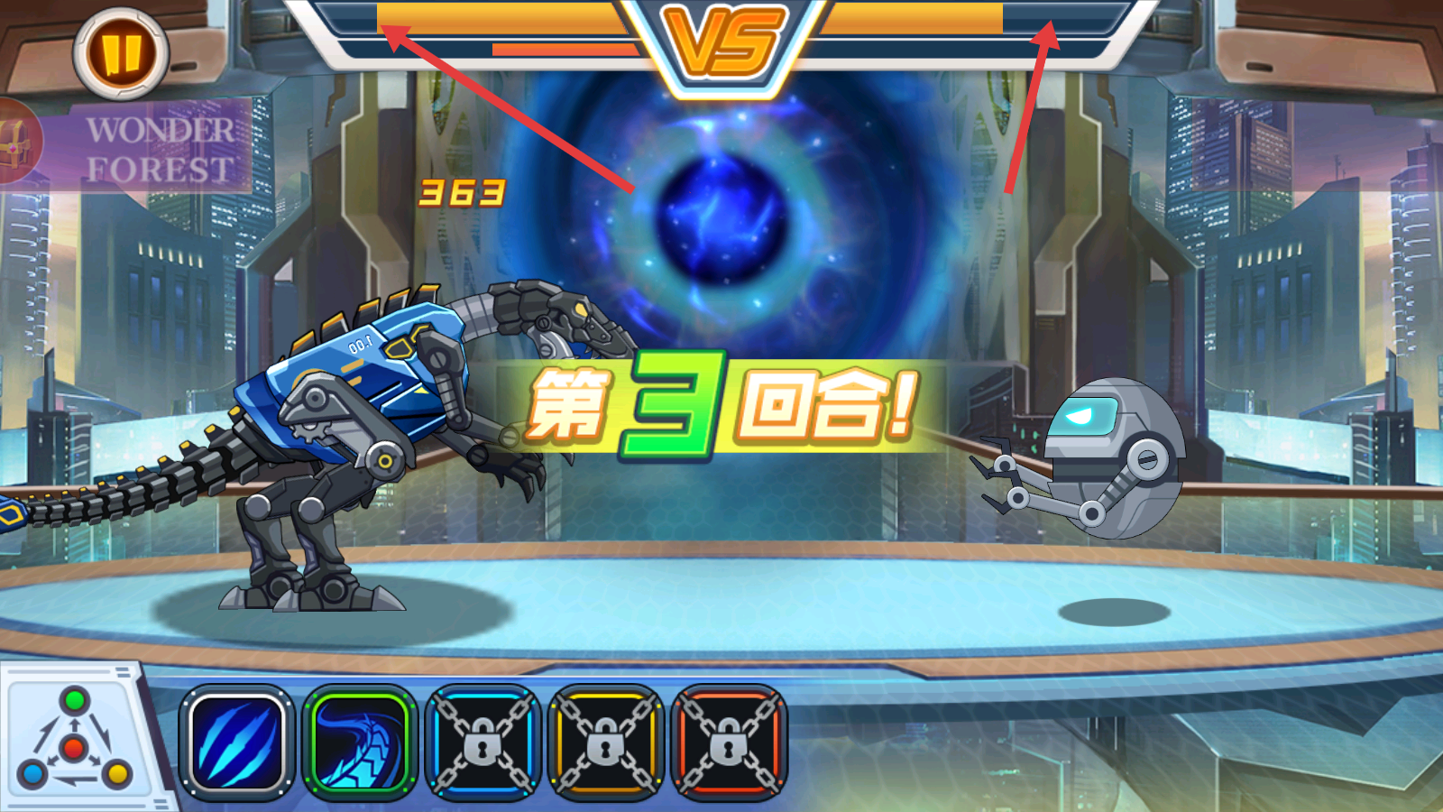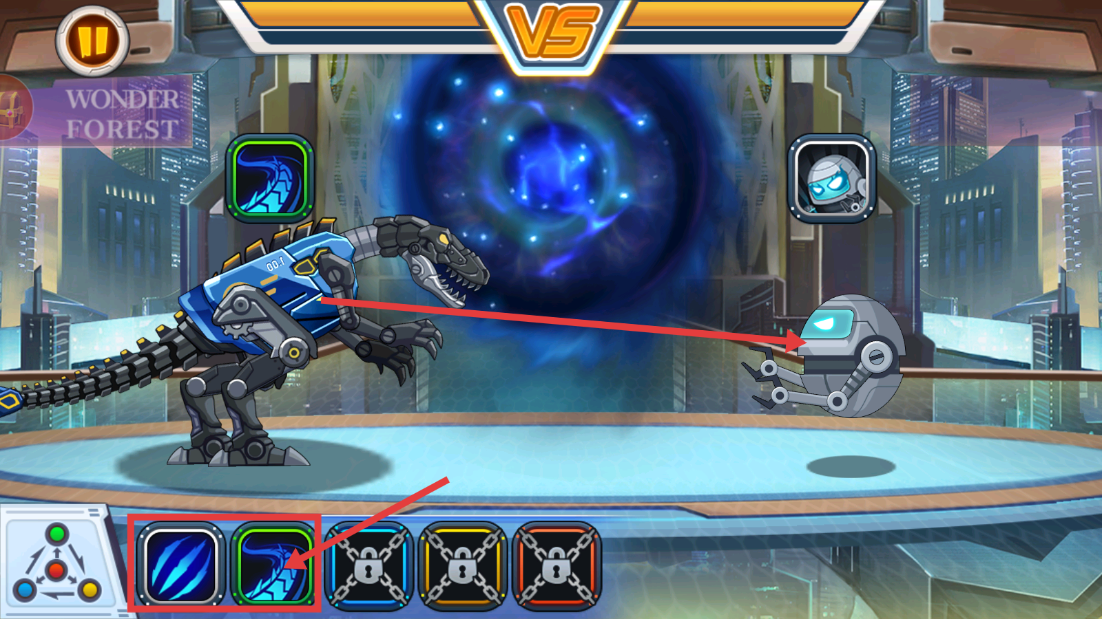 2、战斗中操控机械恐龙,使用下方技能按钮攻击机器人敌人,合理释放技能可高效制胜。