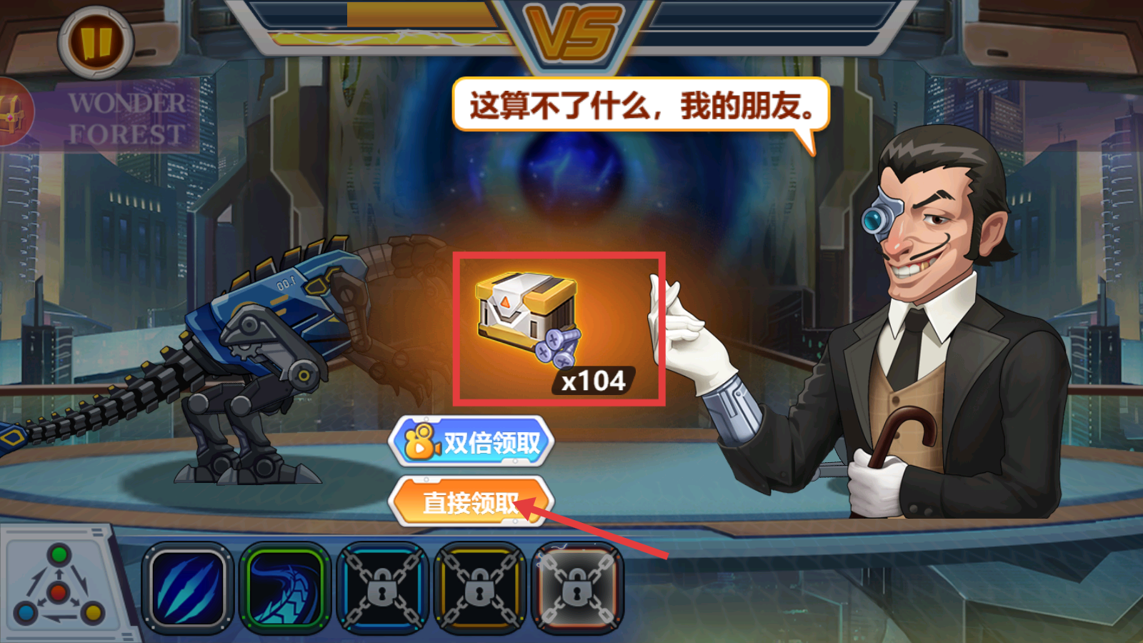 4、战斗胜利后,点击【直接领取】可获得【零件-x104】等奖励,积累资源用于机甲升级。