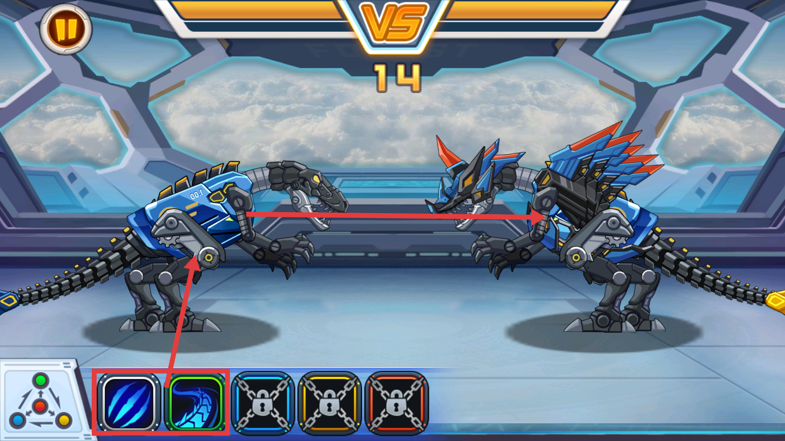 2、对战中操控机械恐龙,利用下方技能按钮(如蓝色刃状、龙形技能)攻击敌方机械恐龙,合理释放技能提升伤害。