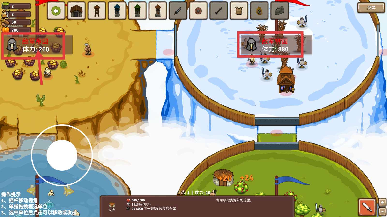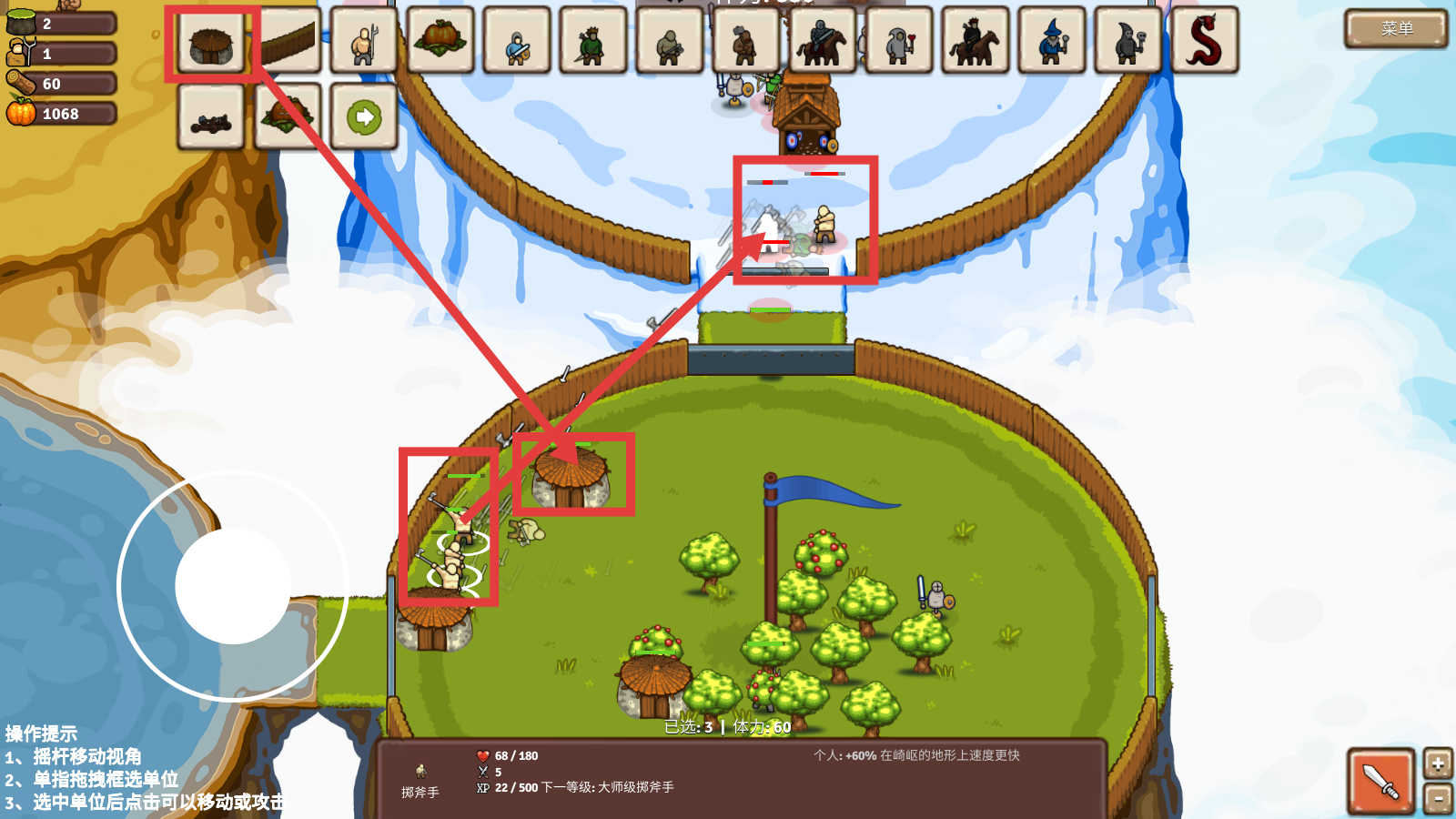 3、建造建筑(如小屋)以生产资源和战斗单位,指挥单位(如投斧手)发起攻击,合理布置防御与进攻,逐步拓展领地。