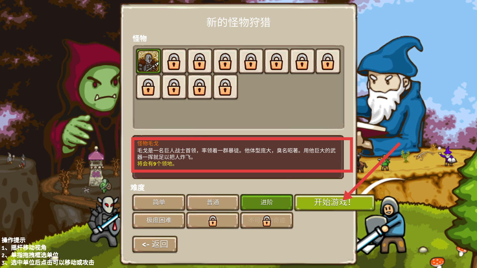 1、选择怪物“毛戈”(巨人战士首领,统领暴徒,拥有9个领地),根据自身实力选择难度(如进阶),点击“开始游戏”开启怪物狩猎征程。