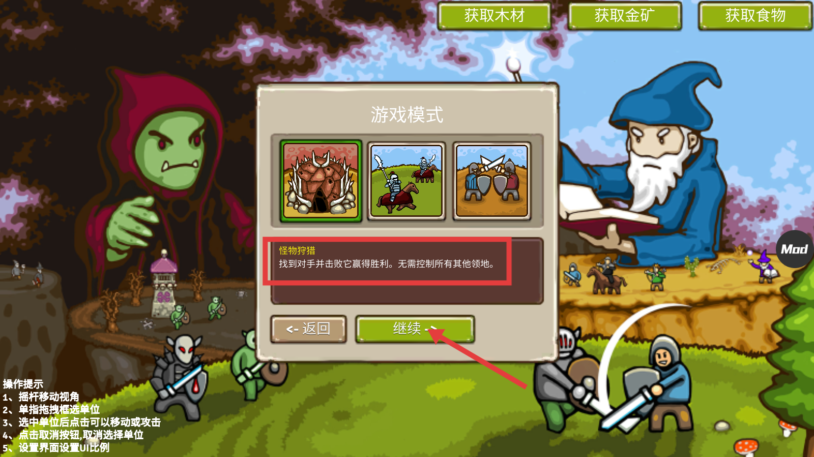 1、选择【怪物狩猎】游戏模式,该模式只需找到对手并击败它即可胜利,无需控制所有其他领地,点击【继续->】进入游戏。