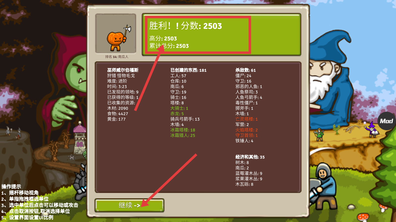 4、战斗胜利后获得【分数-2503】,点击【继续->】查看战果详情,总结资源、单位等数据,积累经验以便下一局更好发挥。