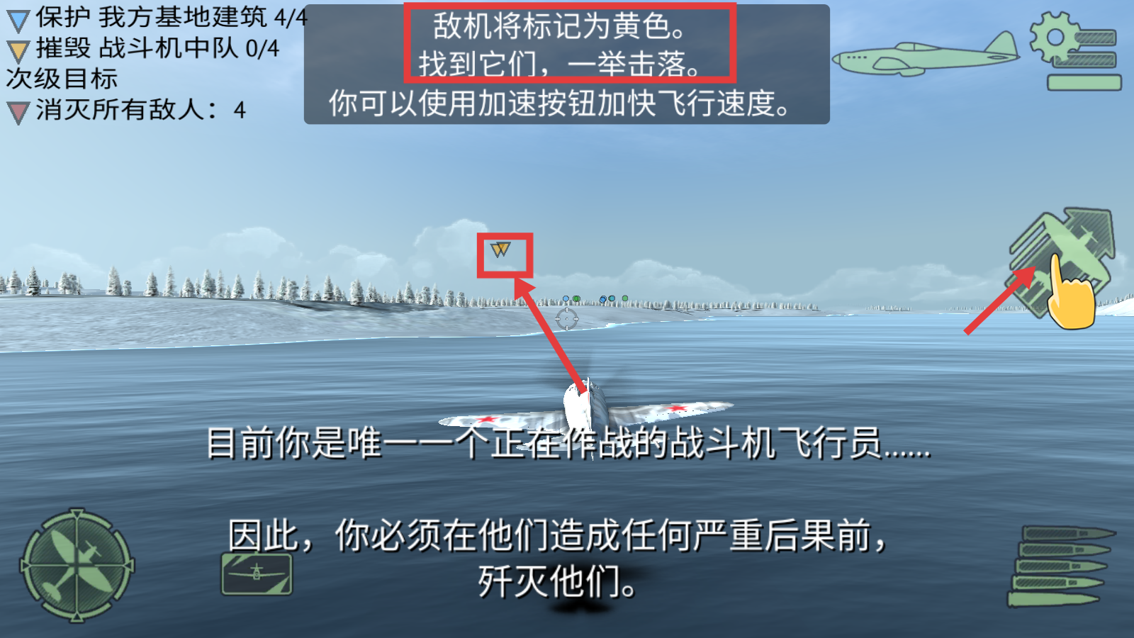 2、敌机将标记为黄色,找到后一举击落,可使用加速按钮加快飞行速度,同时关注任务目标进度。