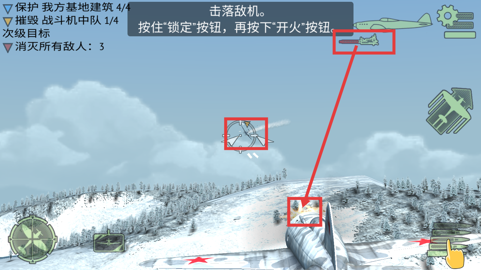 3、击落敌机时,按住【锁定】按钮再按下【开火】按钮,精准打击敌机,推进摧毁战斗机中队的任务。