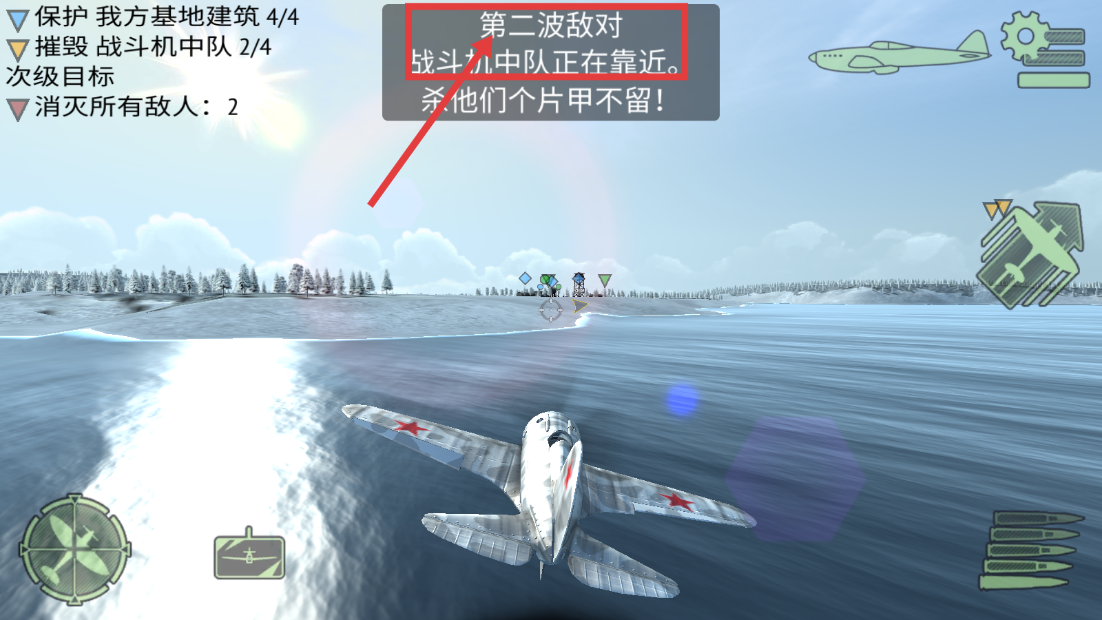 4、注意【第二波敌对战斗机中队】正在靠近,继续消灭敌人,完成摧毁战斗机中队和消灭所有敌人的任务。