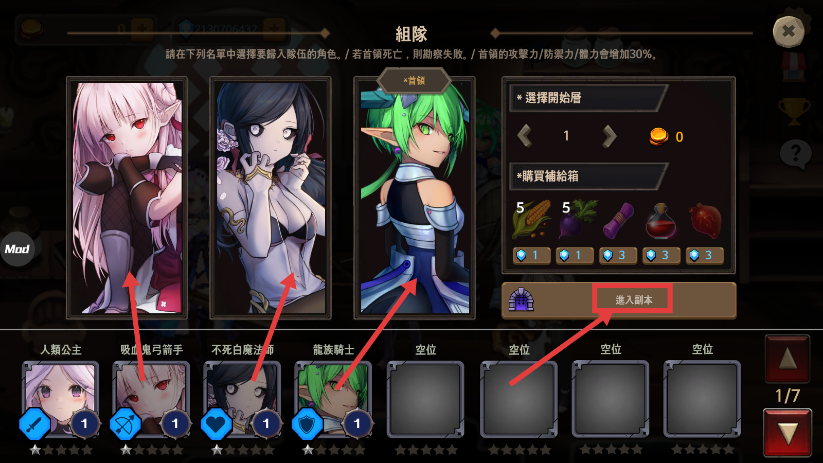 1、在【組隊】界面选择角色,如【人類公主】【吸血鬼弓箭手】【龍族騎士】等,点击【進入副本】开始地牢探索。