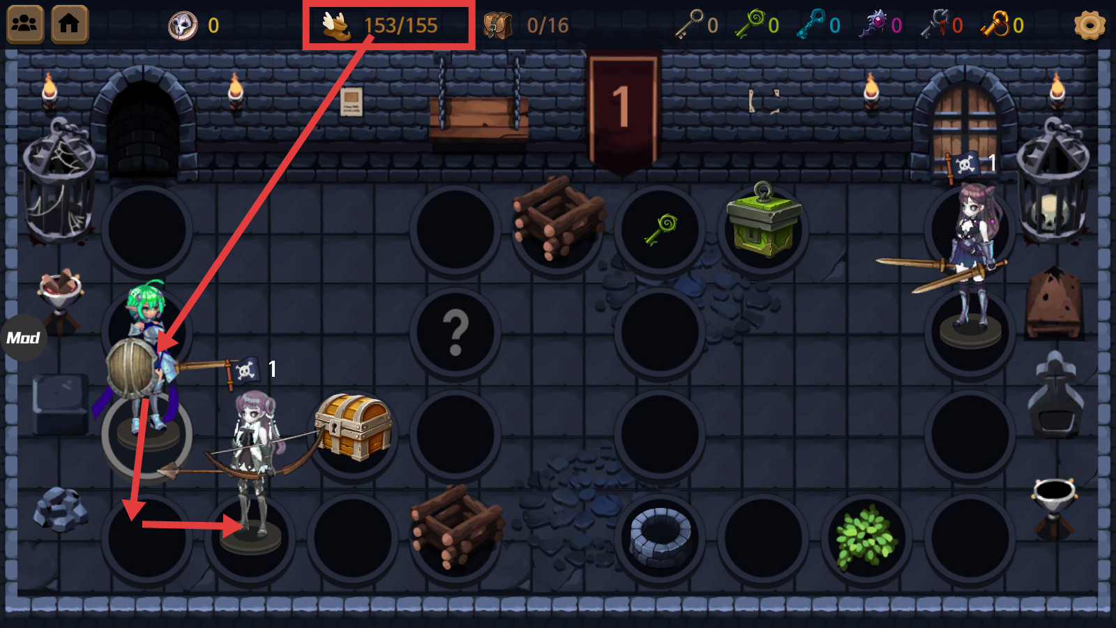 2、在地牢第1层,关注【153/155】资源进度,移动角色探索,留意敌人和宝箱等资源点。