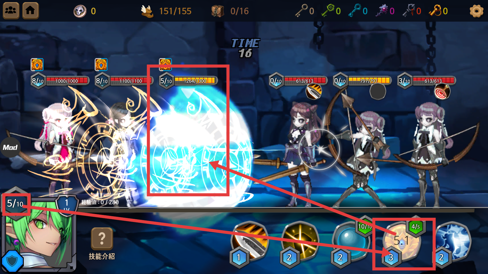 3、战斗时使用技能栏技能,如【技能3】,释放强力攻击,关注【TIME-16】和角色状态,高效击败敌人。