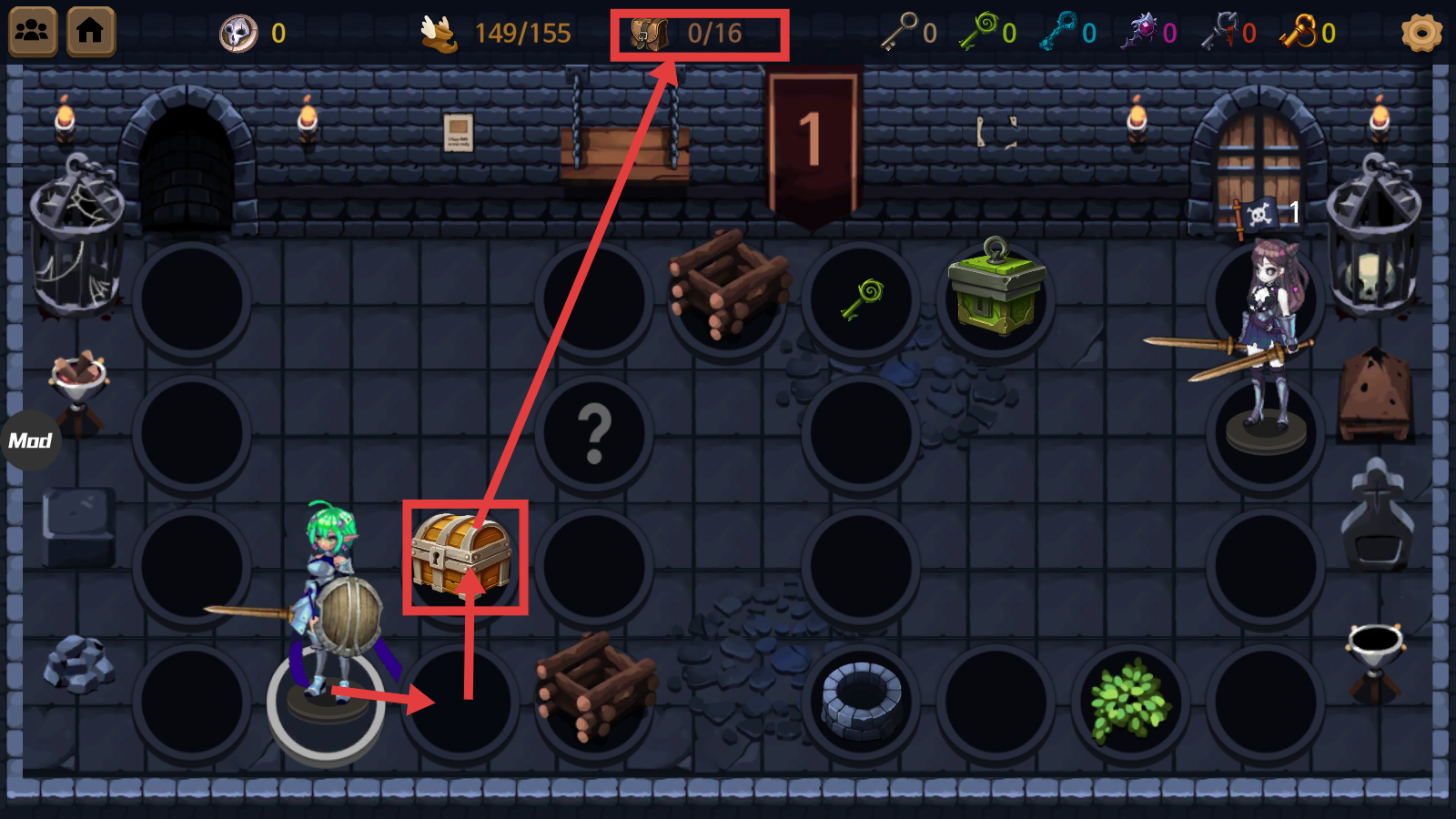 4、在地牢中收集宝箱,推进【0/16】宝箱收集进度,积累资源用于队伍强化和地牢探索。
