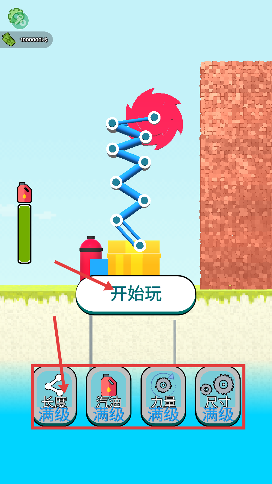 1、在所有升级项(长度、汽油、力量、尺寸)均满级后,点击【开始玩】,利用满级设备开启关卡1挖掘。