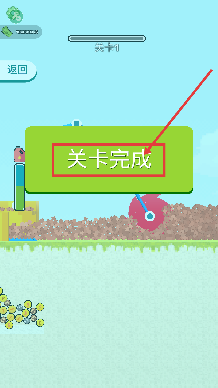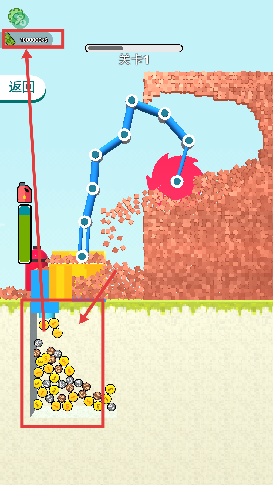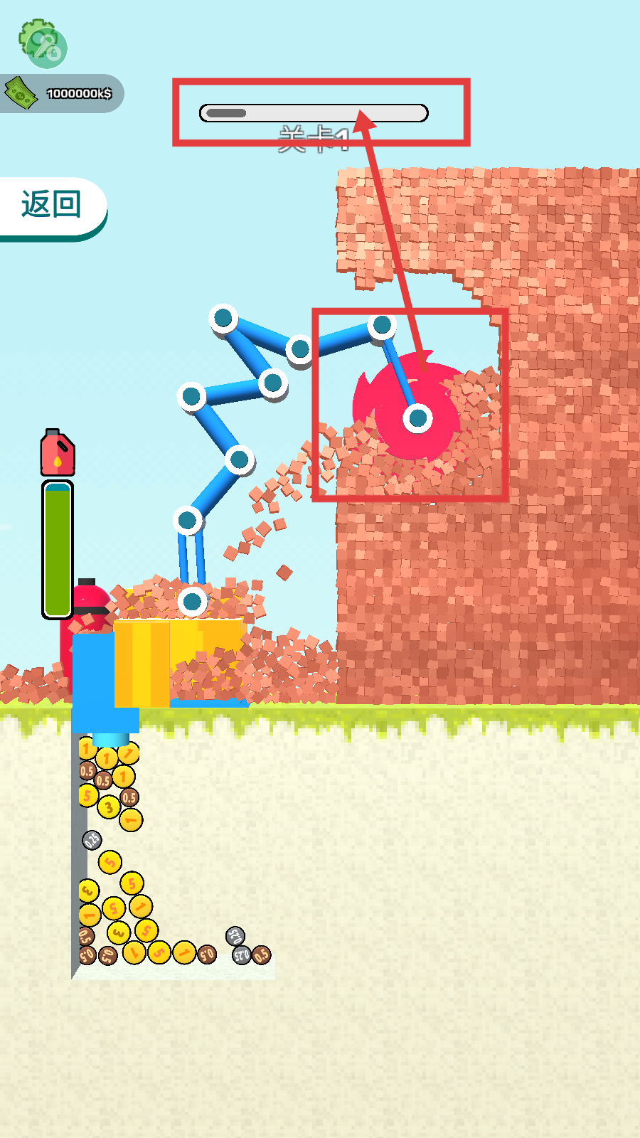 2、在关卡1中,借助满级设备高效挖掘砖块,关注进度条推进情况,快速推进关卡进度。