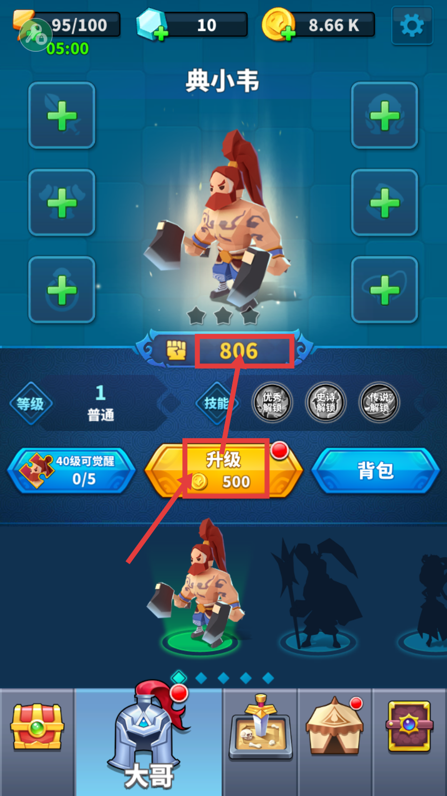 1、进入角色界面,点击【升级-500】金币,提升典小韦战力至806,增强战斗能力。
