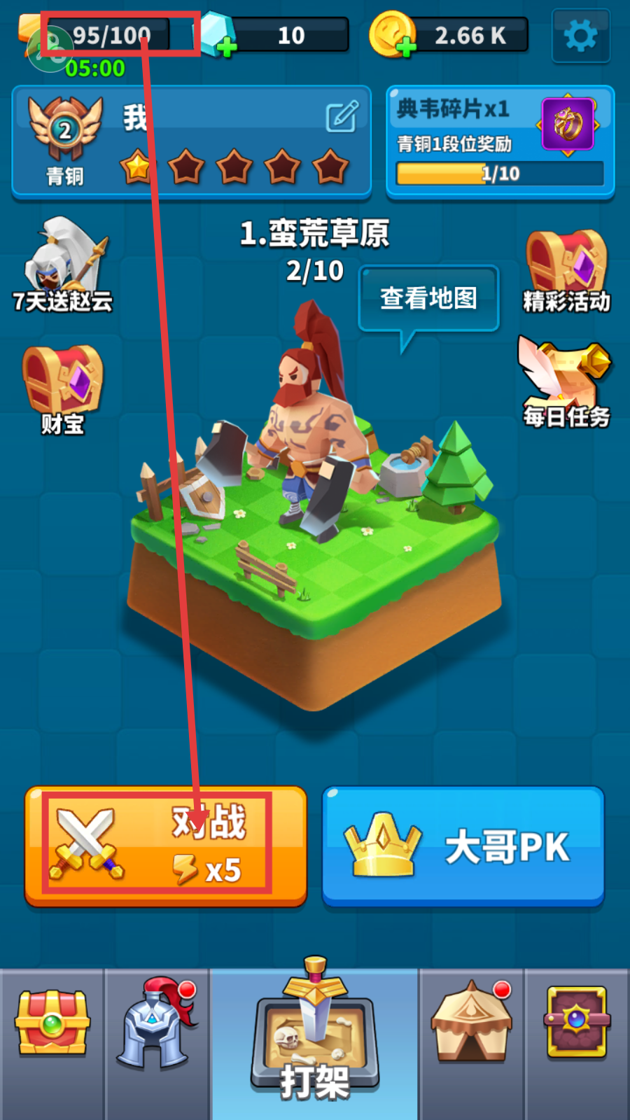 2、在主界面关注【95/100】资源,点击【对战-5】次,参与蛮荒草原关卡战斗,推进游戏进度。