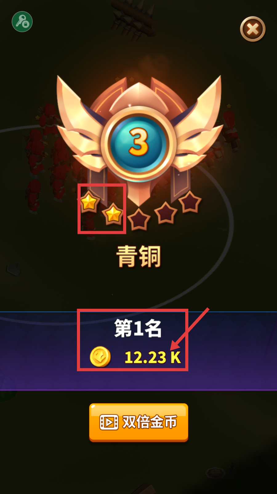4、战斗结束后,若获得第1名,可领取【12.23K】金币奖励,提升青铜段位星级,继续挑战更高难度。