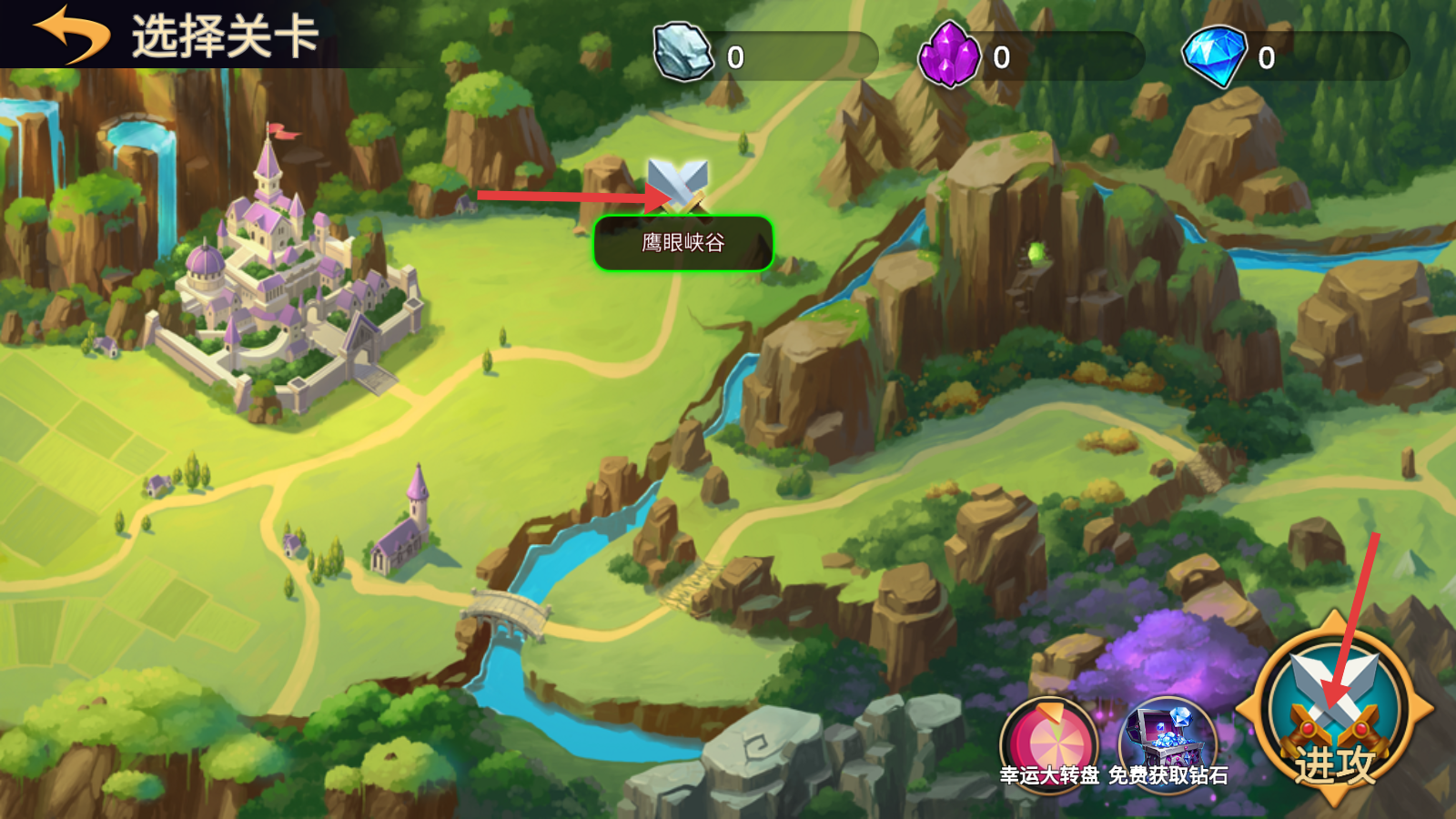 1、在选择关卡界面,点击【鹰眼峡谷】,再点击【进攻】按钮,开启该关卡战斗。