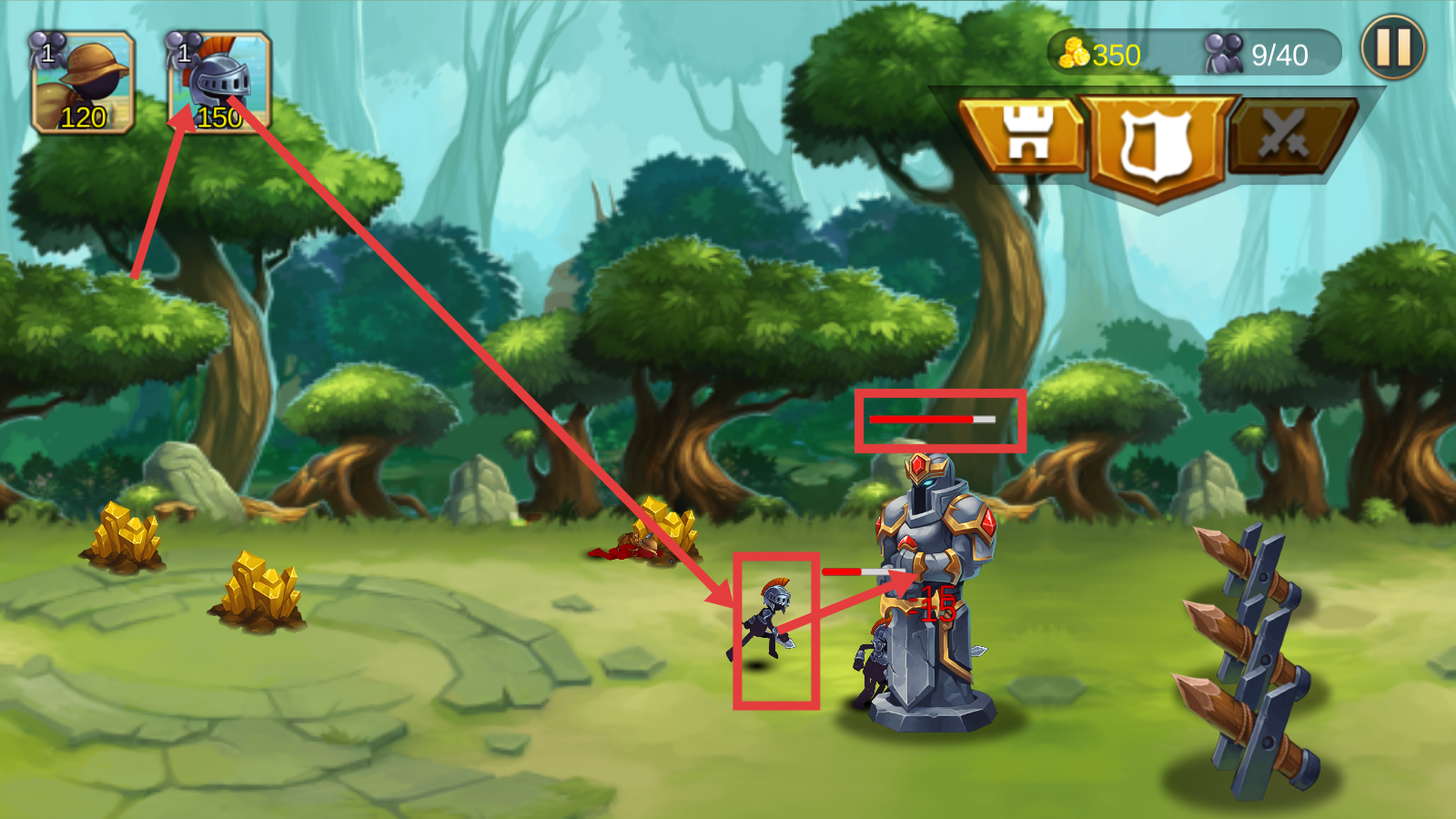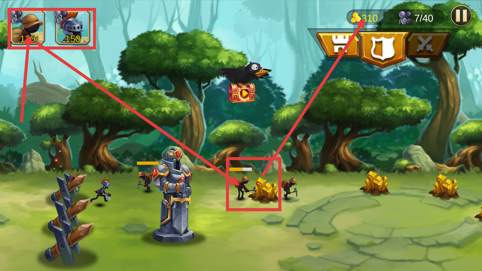 2、战斗时,生产【矿工-120】【士兵-150】,让矿工采集金矿,获取【金币-310】,积累资源。