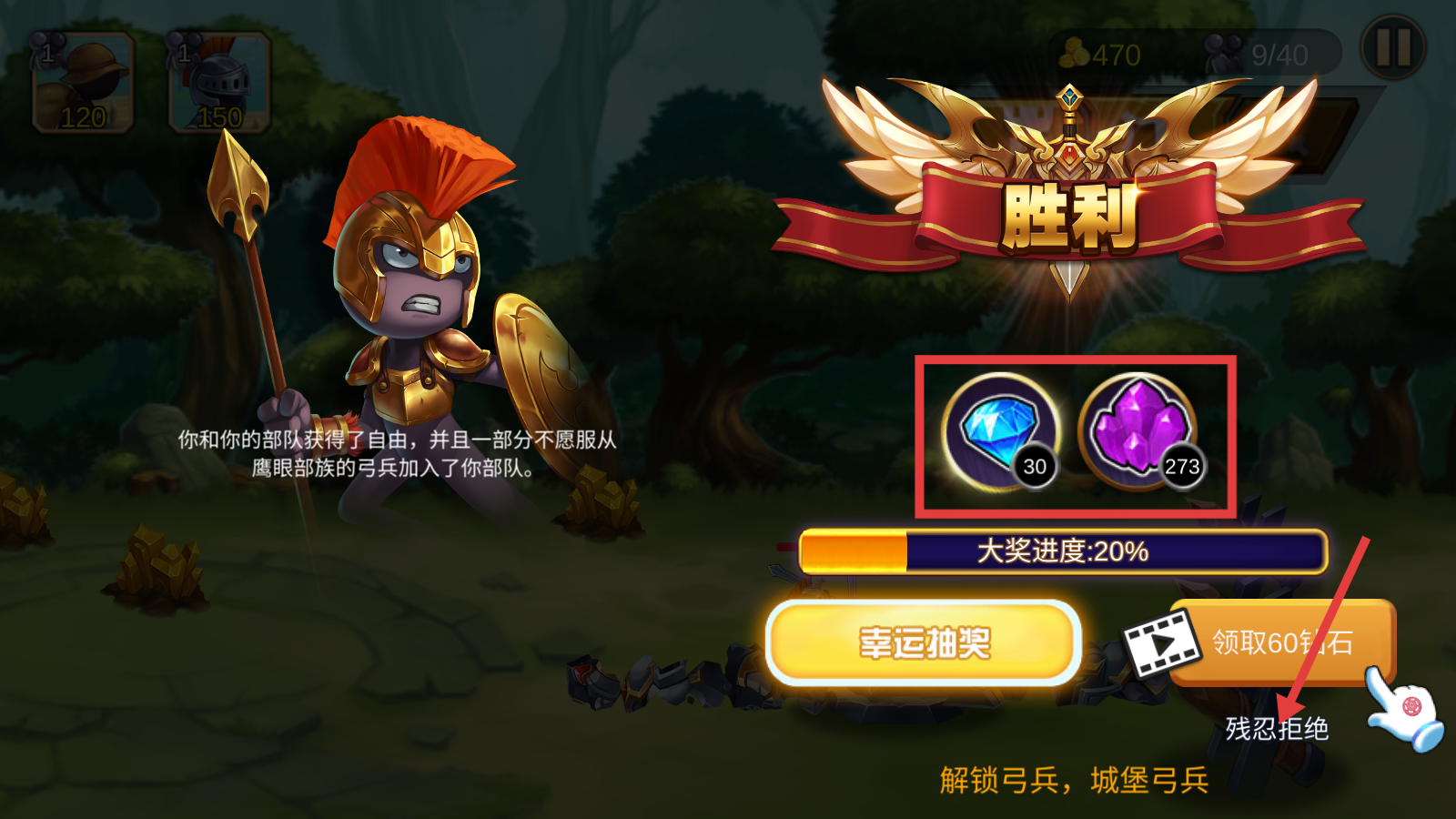 4、战斗胜利后,获得【钻石-30】【紫晶-273】,可点击【残忍拒绝】继续游戏,或参与幸运抽奖。