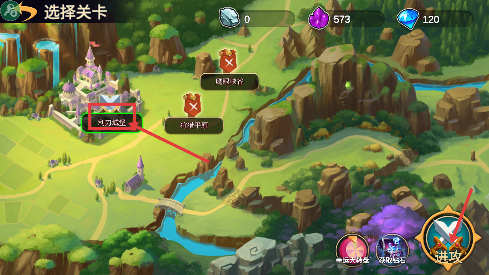 1、在选择关卡界面,点击【利刃城堡】,再点击【进攻】按钮,开启该关卡战斗。