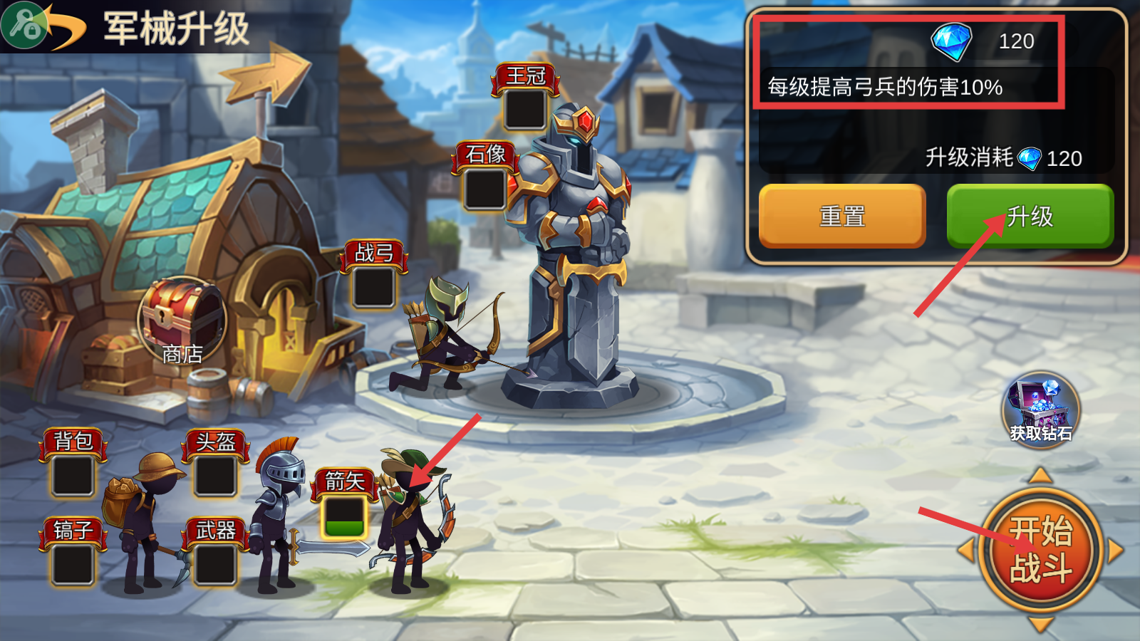2、在军械升级界面,消耗【钻石-120】点击【升级】,提升弓兵伤害10%,再点击【开始战斗】,推进战斗。