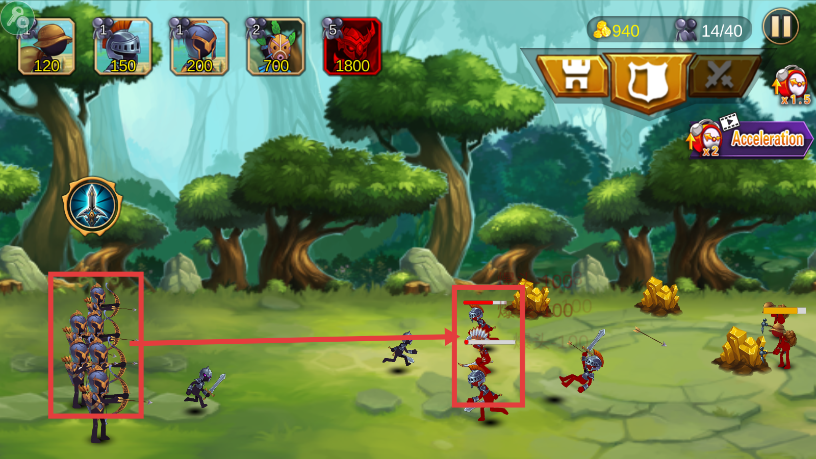 3、战斗时,派出弓兵等单位攻击敌方,获取【金币-940】,积累资源,打击敌人推进战斗。