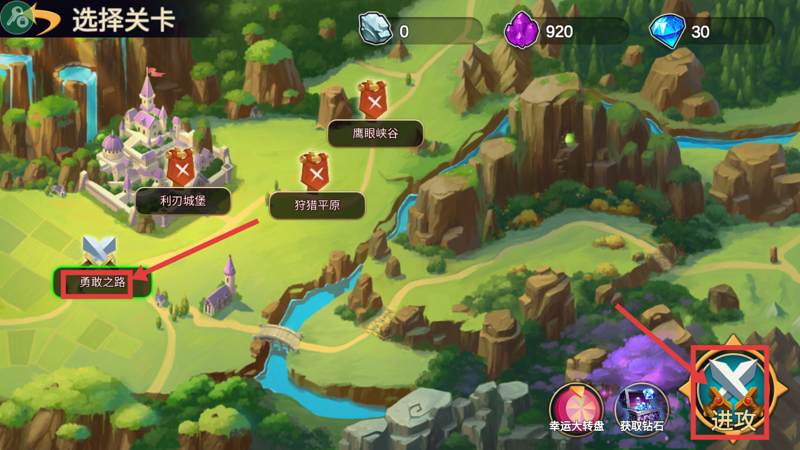 1、在选择关卡界面,点击【勇敢之路】,再点击【进攻】按钮,开启该关卡战斗。