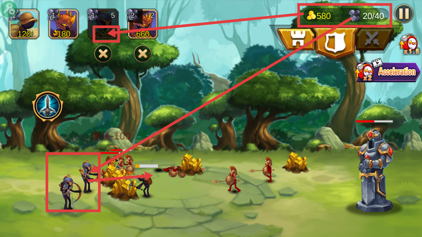 2、战斗时,生产对应单位,积累【金币-580】等资源,提升兵力规模至【20/40】,为战斗奠基。