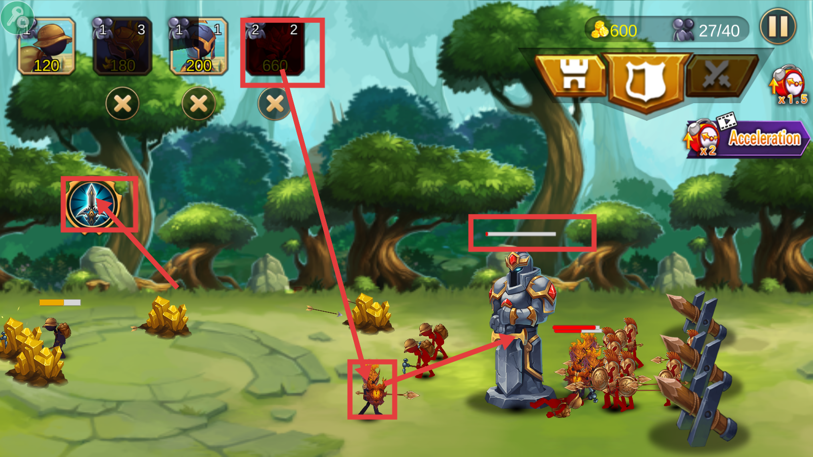 3、战斗中使用技能和【660】战力的高级单位,攻击敌方雕像,消耗其血量,推进战斗进程。
