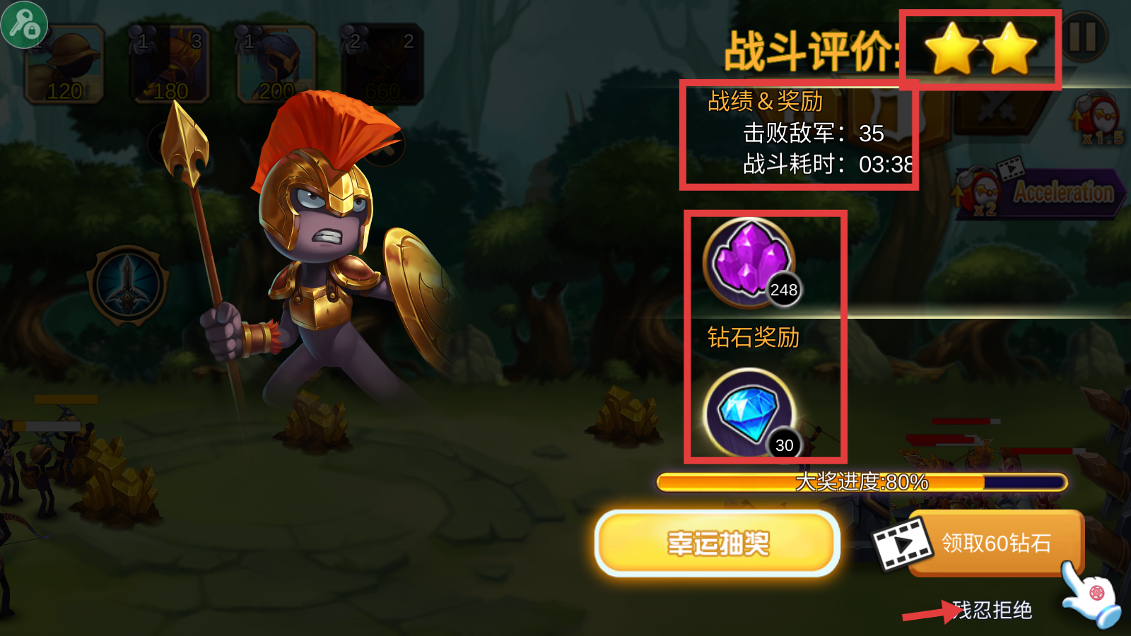 4、战斗结束后,获得【战斗评价-两星】,击败敌军35,耗时03:38,领取【紫晶-248】【钻石-30】,可点击【残忍拒绝】继续游戏。