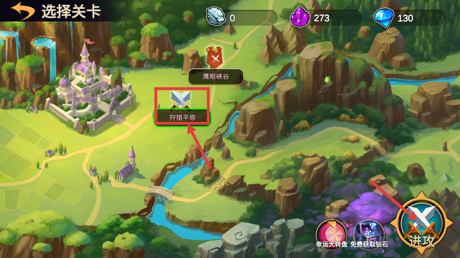 1、在选择关卡界面,点击【狩猎平原】,再点击【进攻】按钮,开启该关卡战斗。