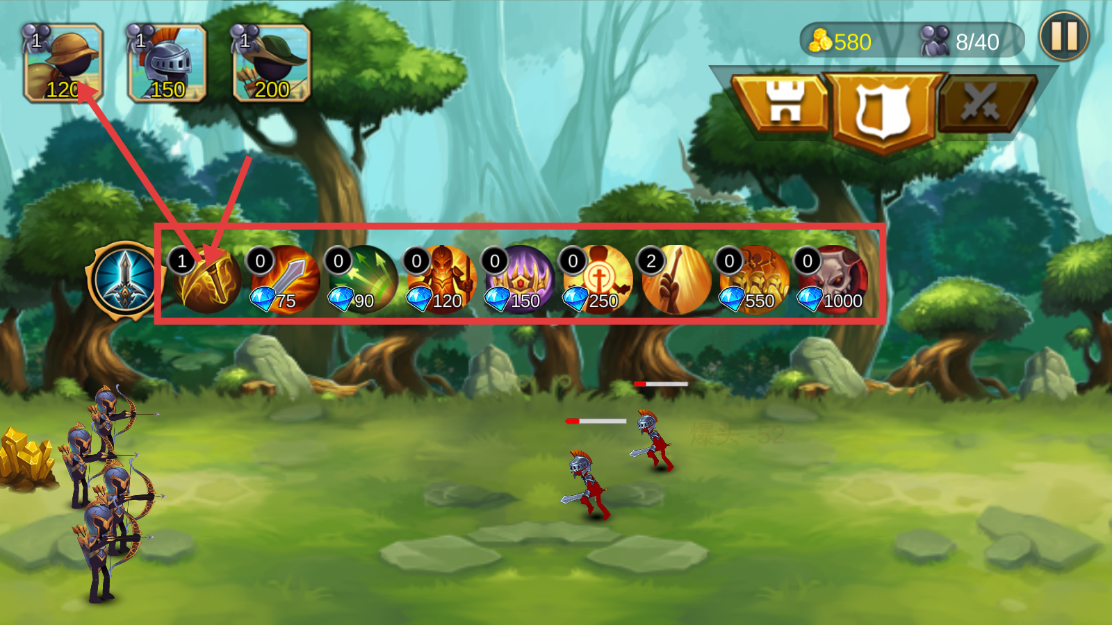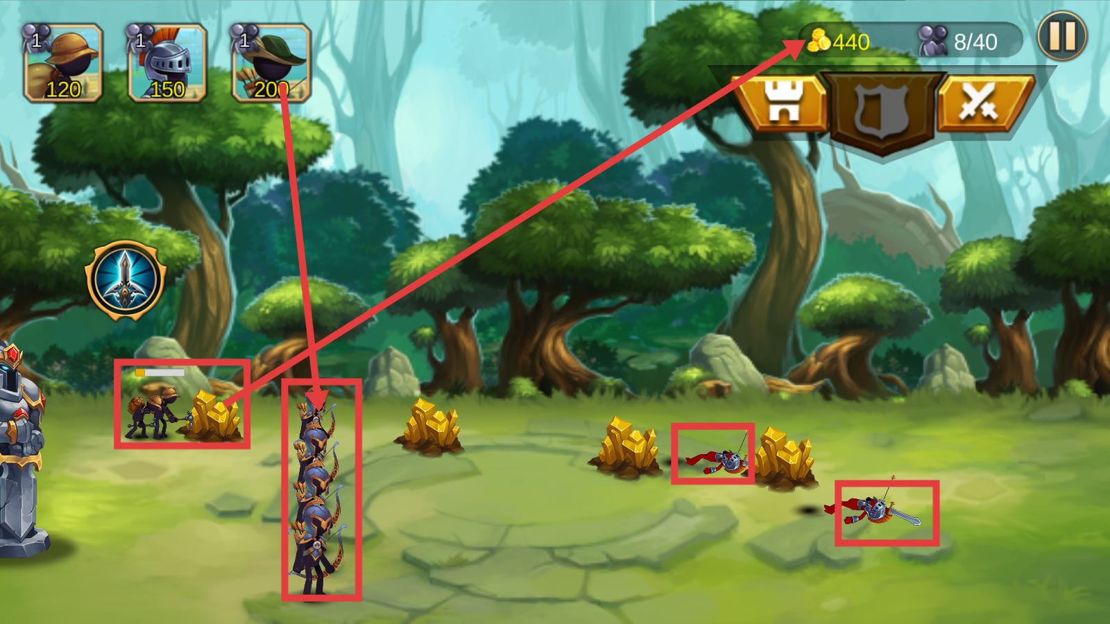 2、战斗时,生产【矿工-120】【弓兵-200】等单位,让矿工采集金矿,获取【金币-440】,积累资源。