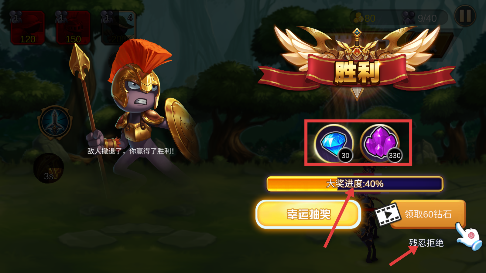 4、战斗胜利后,获得【钻石-30】【紫晶-330】,可点击【残忍拒绝】继续游戏,或参与幸运抽奖。