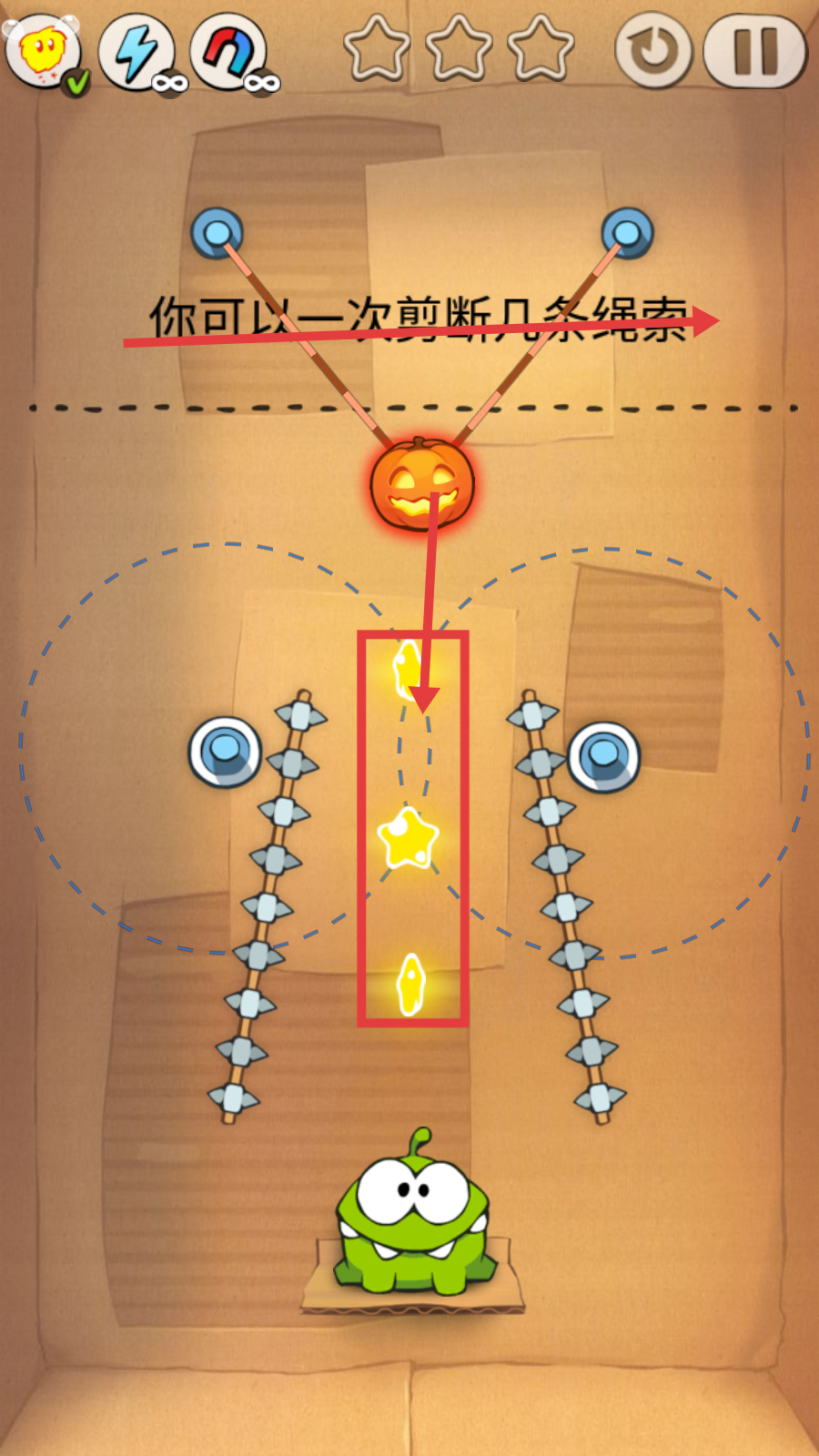 2、在关卡内尝试一次剪断多条绳索,按照路径收集星星和黄色物品,规划南瓜糖果的移动轨迹。