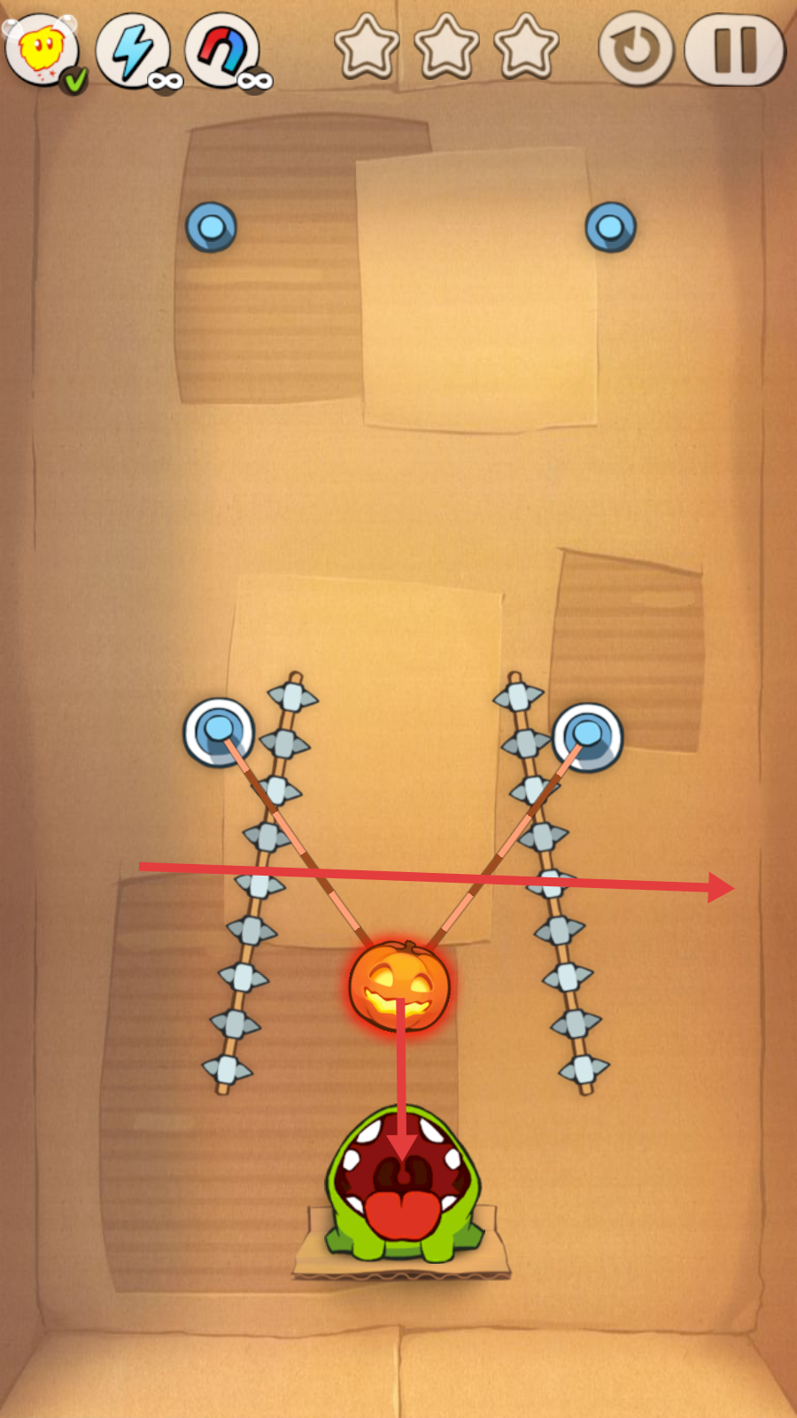 3、精准剪断绳索,让南瓜糖果避开尖刺障碍,顺利落入小怪兽口中,完成关卡目标。