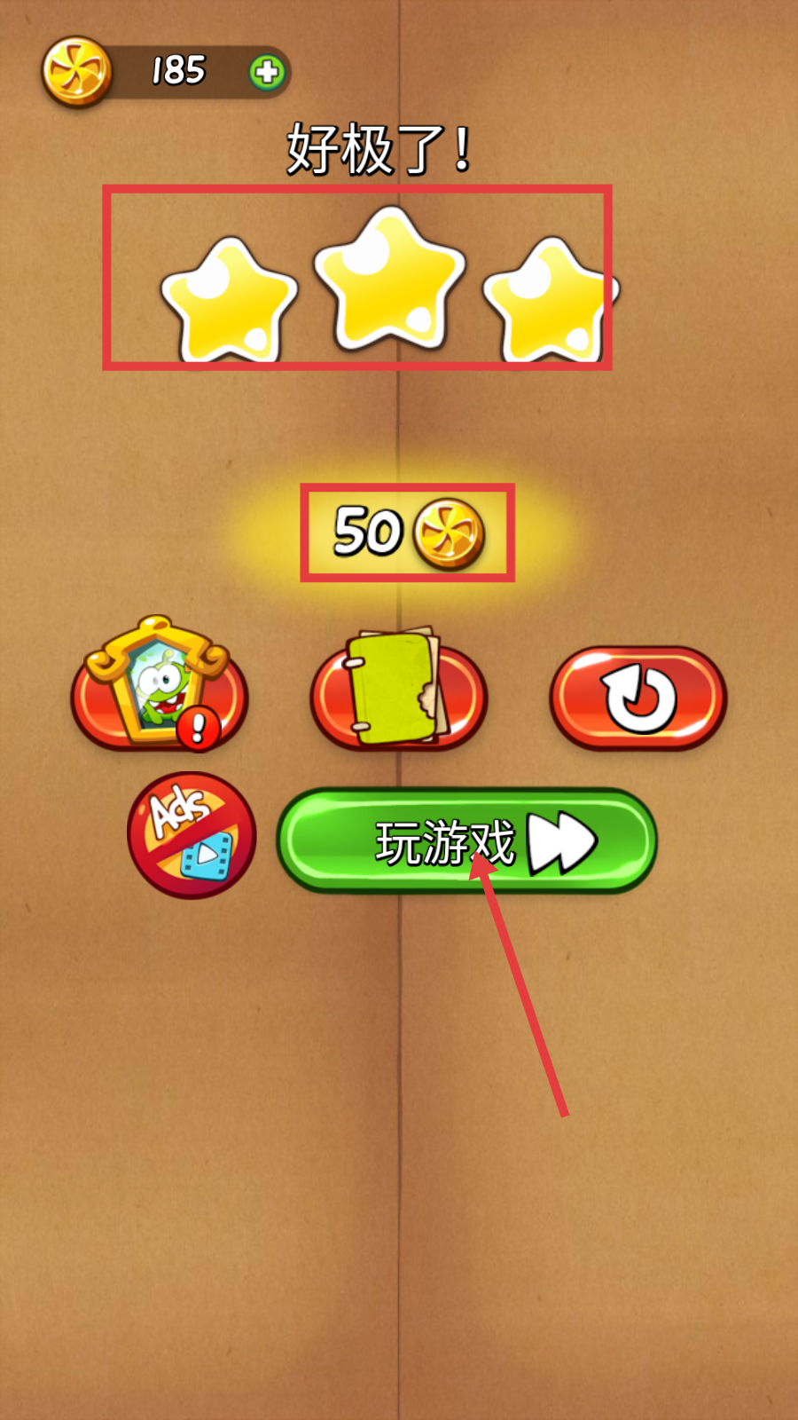 4、通关后获得三颗星星和【50】金币奖励,点击绿色【玩游戏】按钮继续挑战下一关,积累资源解锁更多内容。