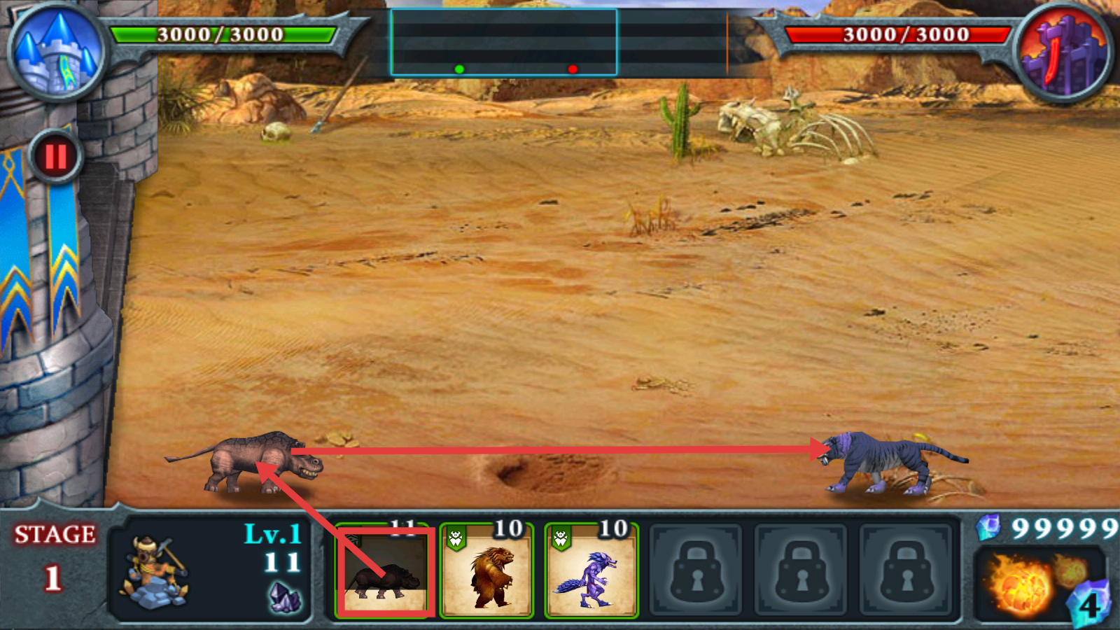 2、战斗时选择下方的生物单位,如【Lv.1-11】的犀牛,派往战场与敌方老虎单位交战,展开资源与城堡的争夺。