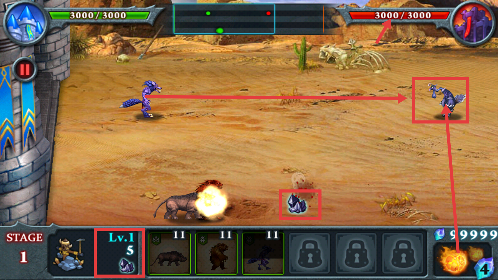 3、战斗中派遣不同生物单位,如狼形生物攻击敌方禽类,同时收集【紫色水晶】资源,消耗敌方城堡【3000/3000】血量。