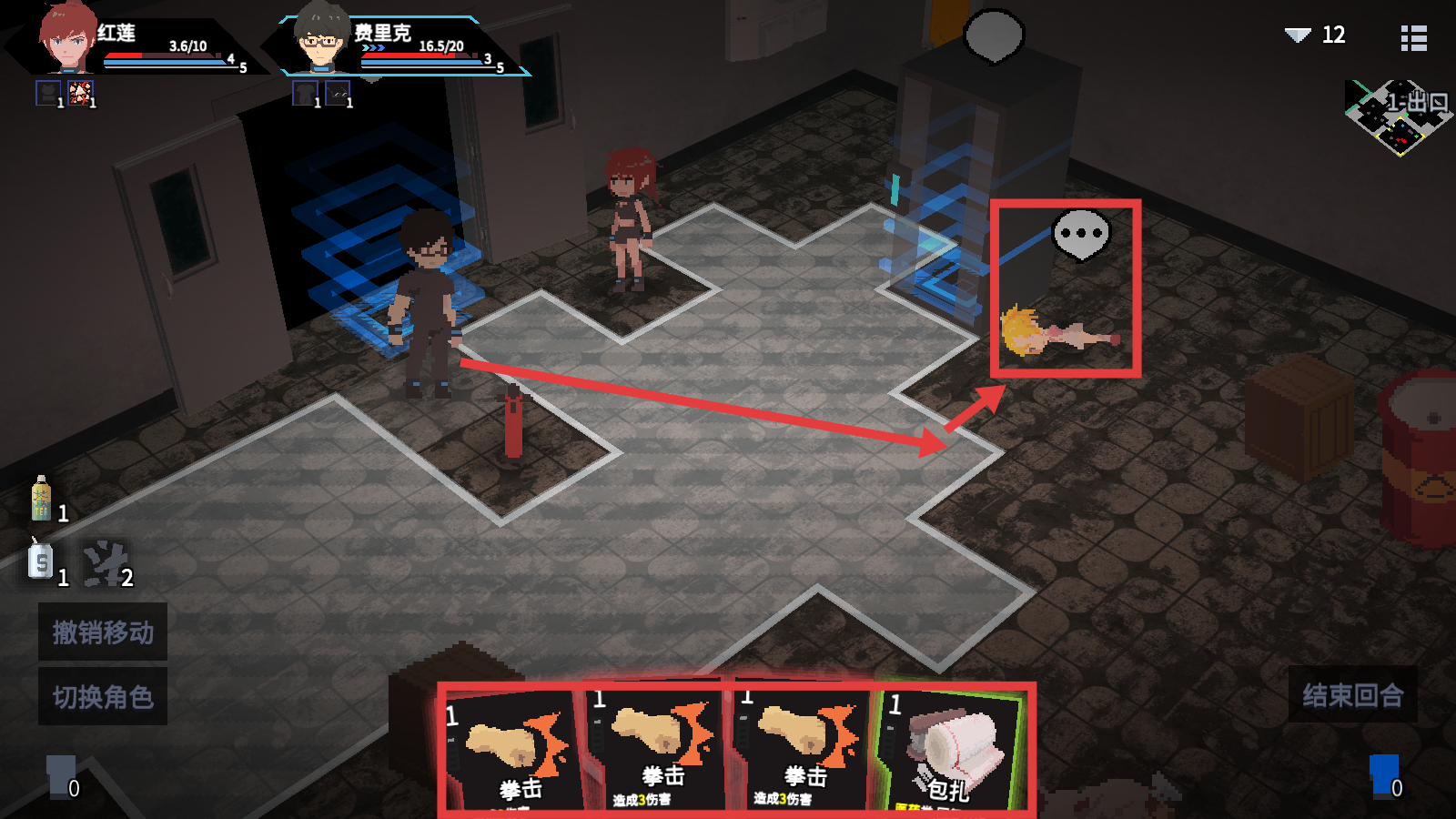 1、移动角色接近倒地少女,利用【拳击】【包扎】等卡牌,为后续剧情与战斗操作做准备。